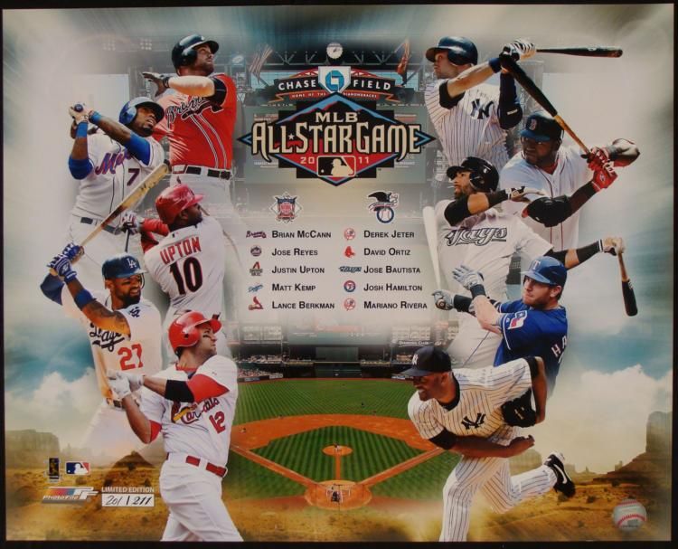 Every year a new and luck team is able to host the All-Star game. In 2011, it was the Arizona Diamondbacks turn to show the fans a good time. This is a 16x20" photographic collage of the some of the headline players who competed. Such names are Justin * Upton, Matt Kemp, Jose Bautista, Mariano Rivera, and more. Each player is in there batting stance (except Mariano Rivera who is closing out another game), with the field in between them. The photograph is of a limited edition, 201/211, has a MLB hologram * at the bottom right, and is in mint condition.