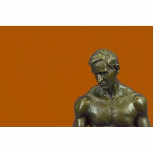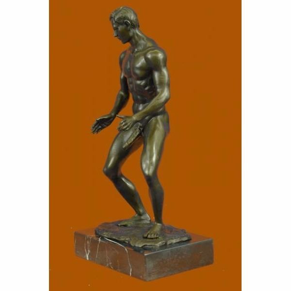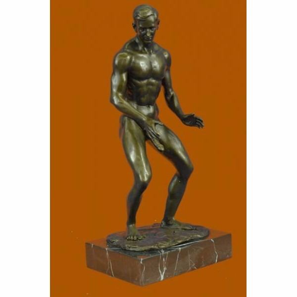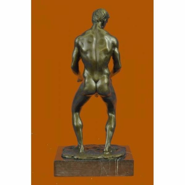 He boldly stands in the buff with a look of fearless determination.This proud gay man stretches his muscular arms in front of him and poses for his admirers. Proving he knows no shame he showcases how well endowed he is, which is Just one example of his gorgeous body. He is a lean and muscular model. Take a gander at his chiseled torso and chest. Please try not to faint. He would be right at home at New York's Chippendale's and would drive all the guys and dolls mad with desire. This confident stud was cast using the "Lost Wax Method". 100% handmade bronze and carefully detailed this is a priceless unlimited edition piece of work and is signed and numbered by artist Mavchi. Condition: This sculpture is in perfect condition. Bronze Dimensions with Marble Base:Height 12" x Width 5.5" Marble Dimensions: 5.5" X 4" Weight : 7 LBS Inventory 63ST855036
