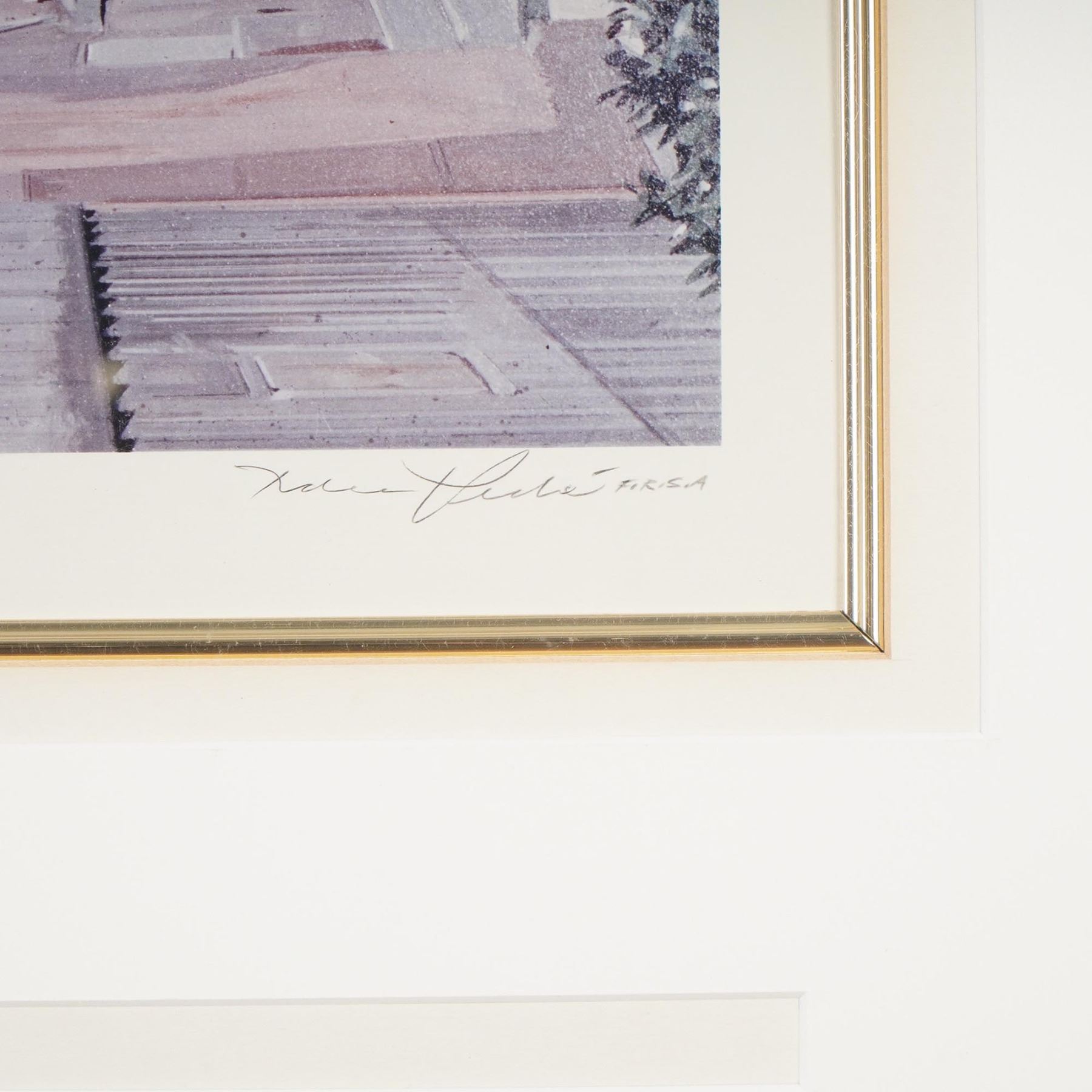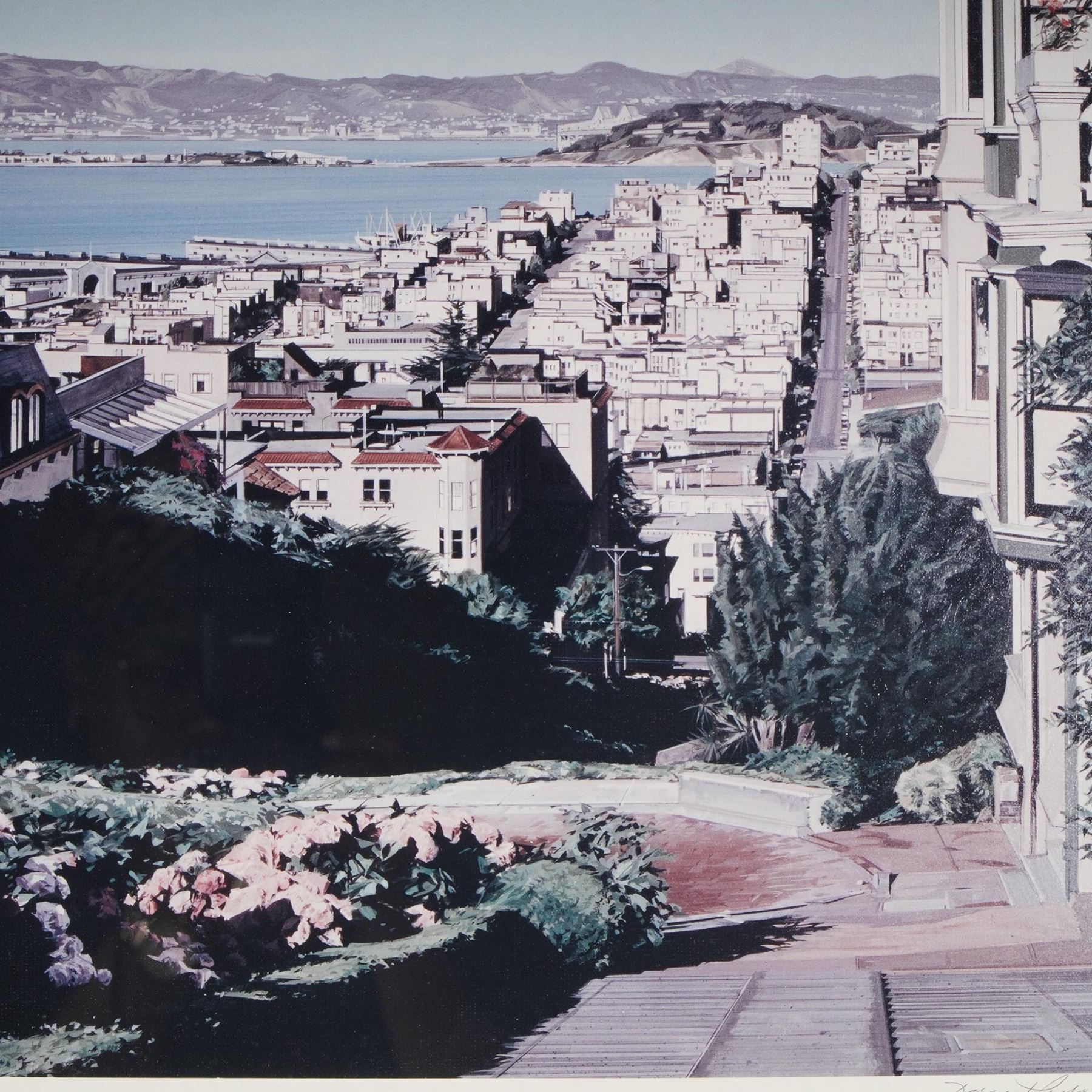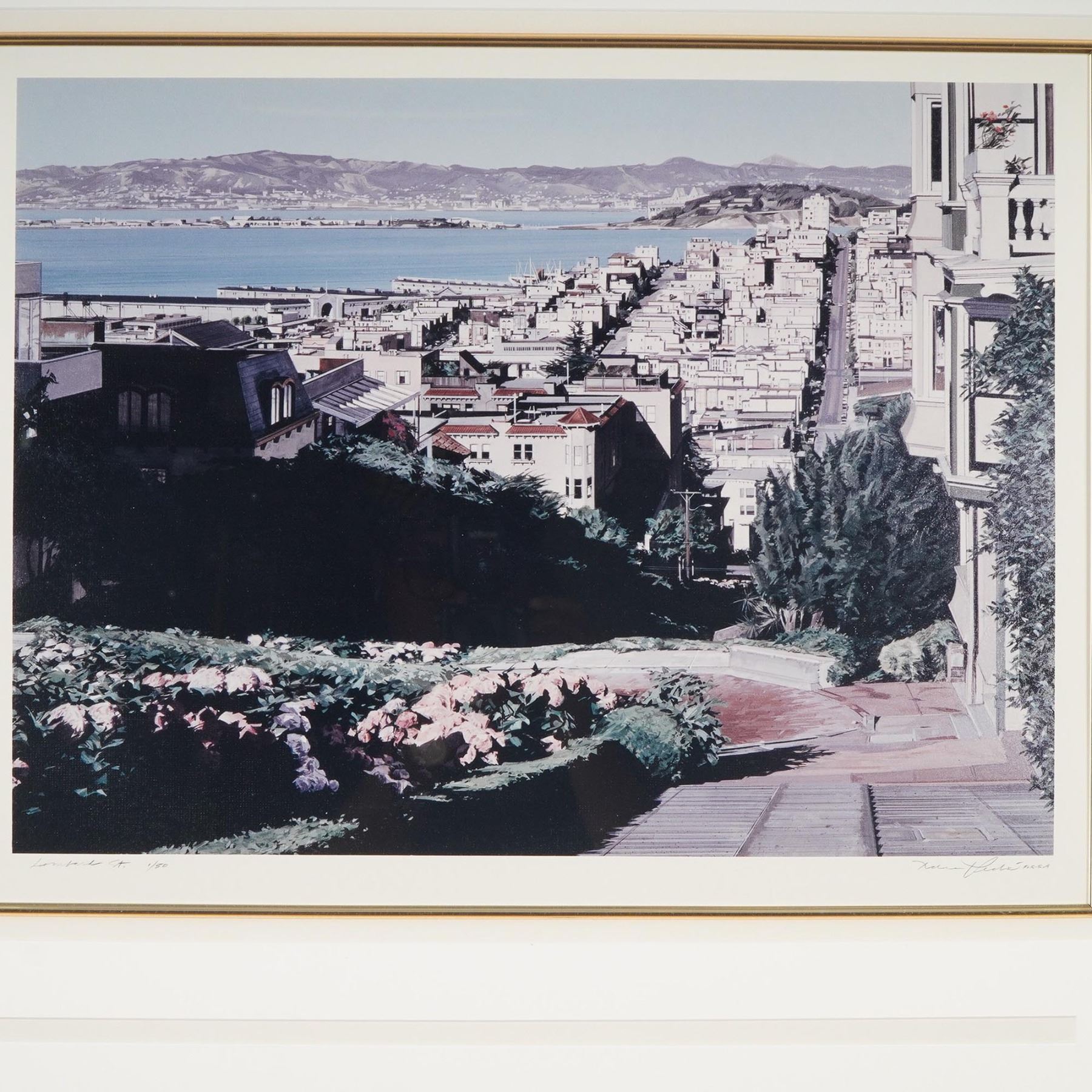Limited edition color print on paper titled Lombard Street, San Francisco, numbered 1/50 and hand signed in the lower right. The image captures a stunning panoramic view down San Francisco's iconic Lombard Street, known for its steep, winding turns, with a vivid portrayal of city rooftops cascading toward the bay. The piece highlights the artist's technical precision and tonal depth, merging architectural realism with serene coastal ambiance. Professionally double-matted and presented in a wood frame with gold trim under glass. Signature on lower right with affiliation Fellow of the Royal Society of Arts (FRSA).