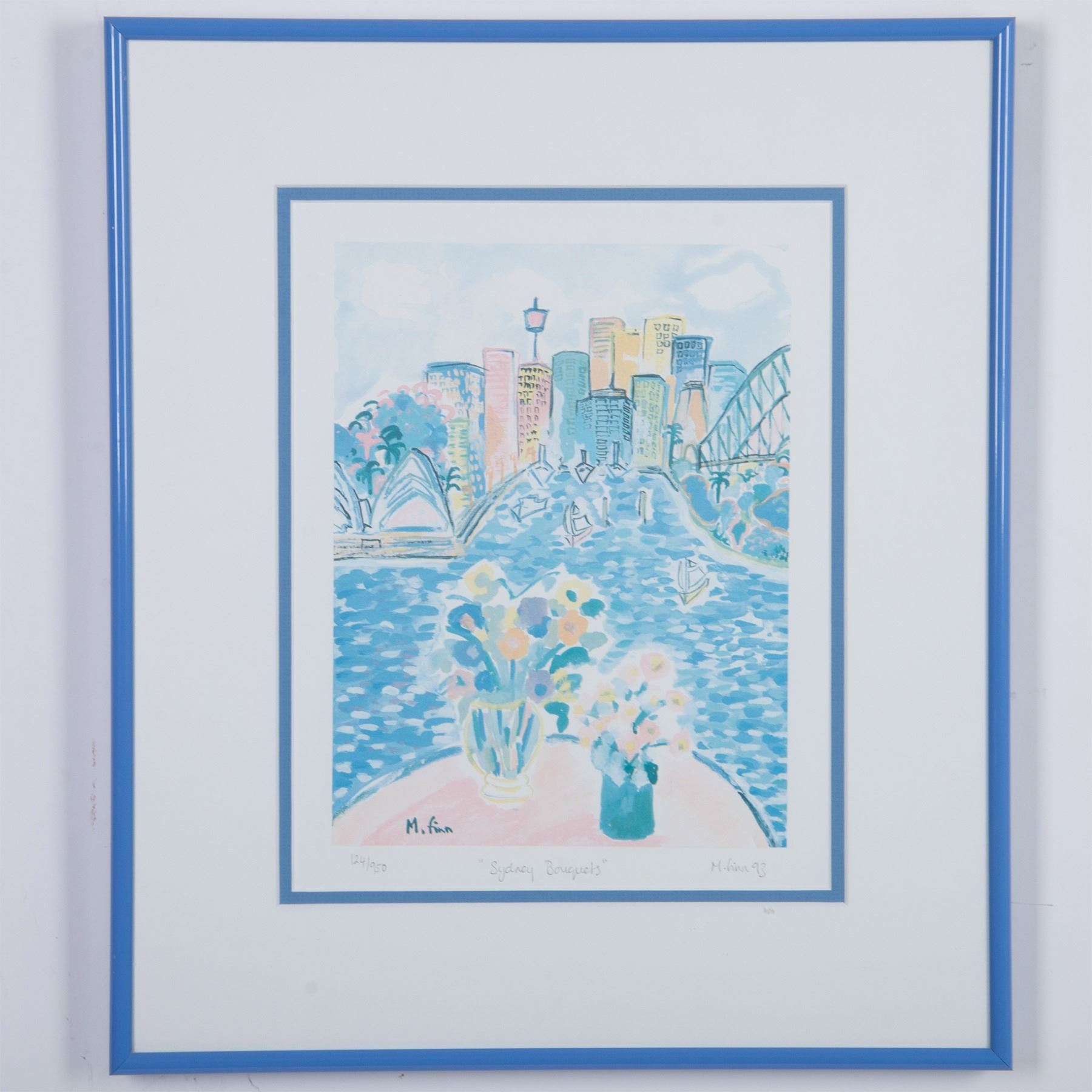 Sydney Bouquets is a limited edition color print on paper featuring a scenic view of the Sydney Opera House, Australia by artist M. Finn. Signature and date in plate and in graphite on lower right: M. Finn, 93. Edition number on lower left: 124/950. Title in center: Sydney Bouquets. Housed in a blue metal frame with a white mat. Sight size: 9"L x 11.50"H. Frame dimensions: 15"L x 17.50"H x 1"W. Artwork can be unframed and rolled for shipment.