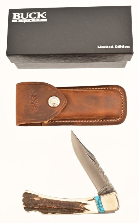 #0136/1000, 3.75" blade with file work to the spine, turquoise inlaid liner, with stag-horn handle. With original box