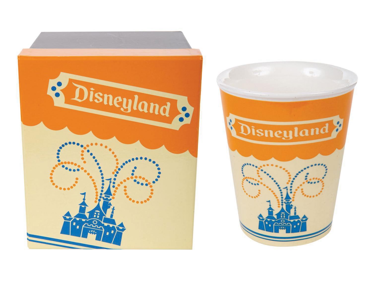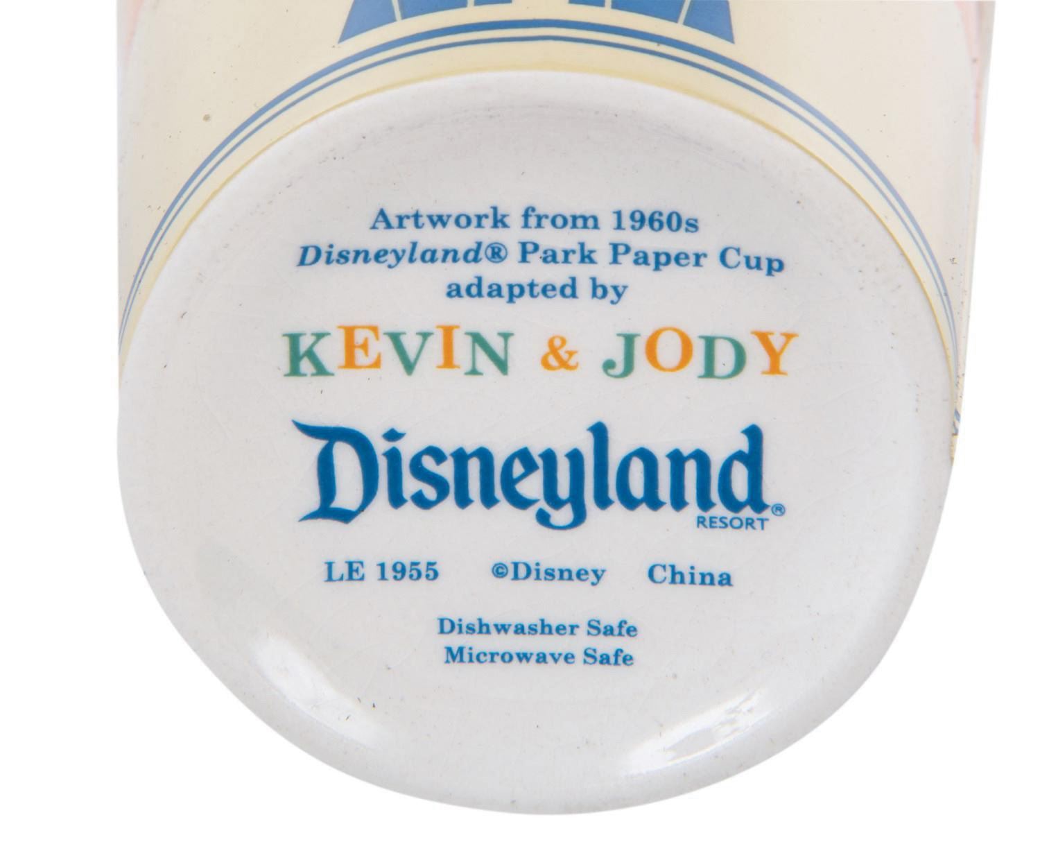 (Disneyland, 2010) A limited edition ceramic cup created by Kevin Kidney and Jody Daily for Disneyland's 55th anniversary. This cup was designed after the iconic Disneyland paper cups from the 1960s, and was created in a limited edition of only 1955. The cup measures 3.5" in diameter and 4.25" tall, and is in very good condition with minor crazing along the base. This item comes with its original box and packaging.