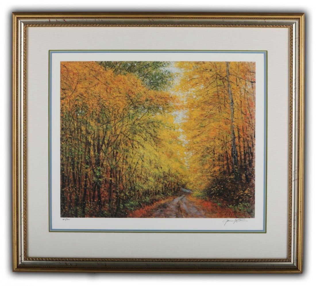 Limited edition fall scene print, signed and numbered 411/900. This piece has been professionally triple matted, and custom framed under glass. Image- 20" x 25". Frame- 33 1/2" x 37 1/2".