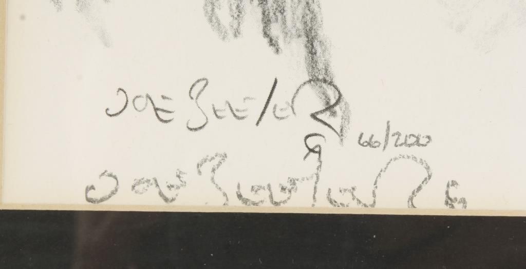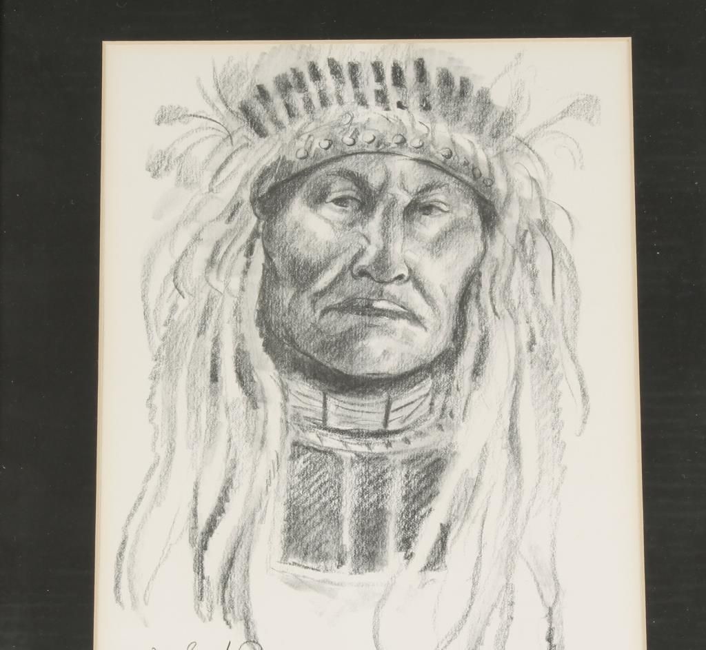 Depicting an American Indian Chief, framed and hand signed by noted artist Joe Beeler. A founding member of the Cowboy Artists of America*, Joe Beeler was a pioneer in contemporary western art and is accomplished in both painting and bronzes. At annual exhibitions of the CAA, Beeler earned numerous Sculpture Awards: Silver, 2000; Gold 1993; Gold and Silver, 1990; Silver 1973; and Gold, 1971, 1969, and 1967. In 2001, he received the CAA Special Lifetime Achievement Award. He was born on Christmas Day, 1931 in Joplin, Missouri and was early recognized as having art talent. He was raised in Oklahoma and Missouri and received his Bachelor of Fine Arts degree from Kansas State Teachers College and continued studies at the Art Center School in Los Angeles. He served in the Korean War and taught at Tulsa University and Kansas State Teachers College, which he later credited as giving him the art background he needed. His art career began with illustration assignments with the University of Oklahoma Press in Norman. He continued as a free-lance illustrator and began selling his work to ranchers. A 1960 one-man show at the Thomas L Gilcrease Museum in 1960 launched his career of national acclaim, honors, and awards. From 1962, he and his family have lived in Sedona, Arizona where his studio has been on five acres of land. In 2002, he was selected by the family of Barry Goldwater, former United States Senator from Arizona, to sculpt the statue of the Senator for a one-acre park named for him at Tatum and Lincoln streets in Paradise Valley, Arizona. Joe Beeler died on April 26, 2006. The circumstances were fitting for this man whose life had been dedicated to memorializing the American west, especially his home state of Arizona. He died on his Sedona ranch of a heart attack while dragging calves to a branding fire. "No cowboy could ask for a better way to go than being horseback and with his boots on. Mr. Beeler died doing what he loved."