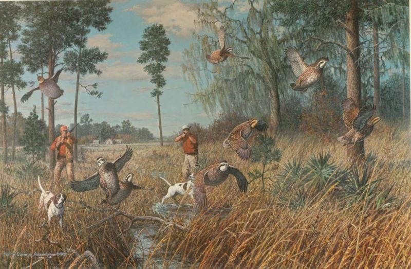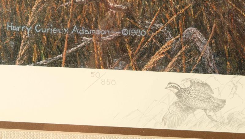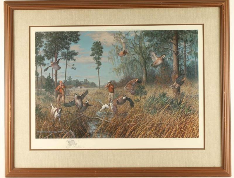 "Broomsedge Cover-Bobwhite" Signed in pencil lower right with remarque of grouse on the left 50/850. Image measures 18 1/2"x26 1/4" in double mat with wood frame.