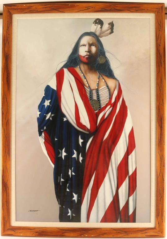 depicting Native American warrior wrapped in an American flag, artist signature lower left, number 5/95. Hand signed by artist in marker on backside of canvas. Image measures 44 1/2"x29 1/2" in wood frame with linen inset. Scratch on left side of canvas in flag, with loss to color and frame has some dings to finish.