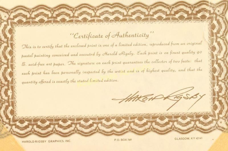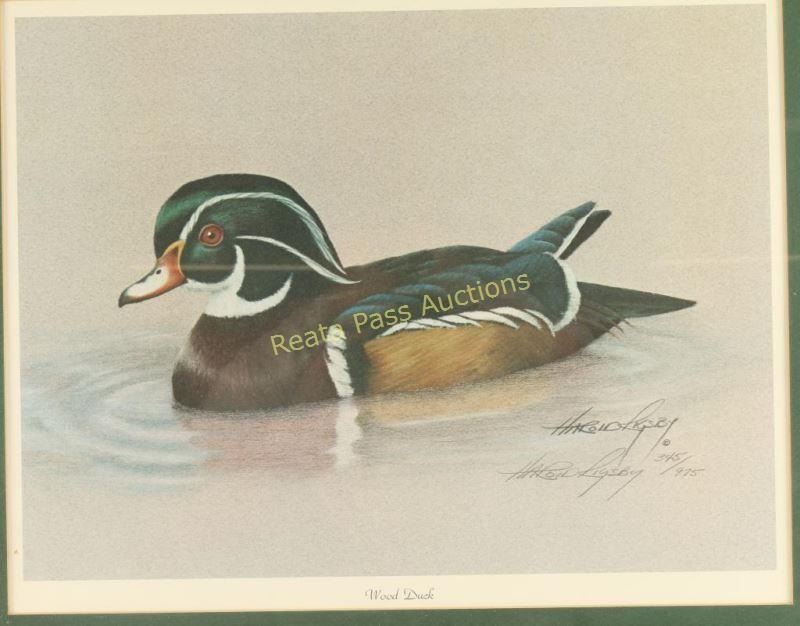 "Wood Duck" by Harold Rigsby signed lower right, 345/975. Image measures 16 1/2"x13" in single mat with wood frame. Includes certificate of authenticity. Harold Rigsby holds a degree with honors from Herron School of Art-Indiana University and has studied at Western Kentucky University, The Louisville School of Art and in Mexico at the Instituto-Allende. After Art School Rigsby spent three years at a tourist attraction working as a portrait artist. In 1975 he accepted a position with a pharmaceutical company as advertising director. In 1978, while still working in advertising, Rigsby released his first print. The edition of 3000 prints sold out in three weeks. This produced the income to do what he had so often wished for, and that was to paint full time. From a selection of 25 original works, the "Siberian Tiger" was chosen to print. This was the first of his wildlife prints and the beginning of an ever growing and successful career. Rigsby finds his subjects in zoos across the country. He will often spend hours studying a single animal from life. Sketches and photographs are made from which the finished work is produced in his home studio. Rigsby is adept in several mediums although pastels are his favorite for wildlife paintings. He strives to make each of his paintings literally come to life.