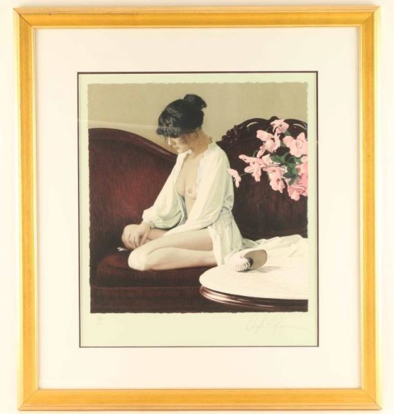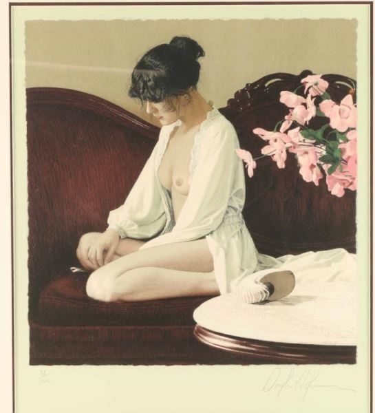 by Douglas Hoffman entiled Pink Flowers, #36/100, hand signed by artist. Image size is 18"x15". Douglas Hofmann was born in Baltimore in 1945. He began working in a department store as a window trimmer, learning about design and color theory, which inspired him to try his talent at fine art. He enrolled at MICA which, at the time, was his local art school. He received his BFA from MICA and moved to the International Fine Art Gallery in Washington, D.C. In 1977, Douglas began his relationship with Circle Fine Art Gallery, exhibiting across the United States and Canada. Working with Jack Solomon at his galleries pushed Hofmann to learn the medium of lithography – a brand new experience for him. Used to working alone, with lithography, Hofmann relied on the expertise of the printer. Eventually Hofmann mastered the medium, awarded by the Society of American Graphic Artists. Hofmann is the recipient of numerous awards and prizes, including first prize at the Peale Museum, Baltimore; “Best Painting in the Traditional Manner,” Baltimore Museum of Art; “Best in Show,” Washington County Museum, Hagerstown, Maryland; “Best in Show,” Center Club, Baltimore; and the John F. and Ann Lee Stacey Scholarship Fund Grant.