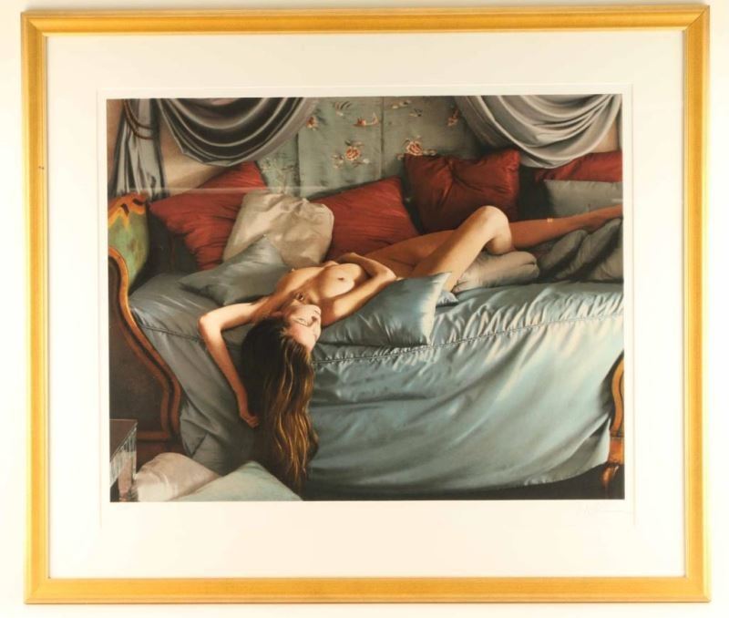 by Douglas Hoffman, "Reclining Nude", # 180/295, hand signed in pencil, image size is 28"x22", in gold frame includes certificate of authenticity and just the print was gallery priced at 1050.00 unframed. Douglas Hofmann was born in Baltimore in 1945. He began working in a department store as a window trimmer, learning about design and color theory, which inspired him to try his talent at fine art. He enrolled at MICA which, at the time, was his local art school. He received his BFA from MICA and moved to the International Fine Art Gallery in Washington, D.C. In 1977, Douglas began his relationship with Circle Fine Art Gallery, exhibiting across the United States and Canada. Working with Jack Solomon at his galleries pushed Hofmann to learn the medium of lithography – a brand new experience for him. Used to working alone, with lithography, Hofmann relied on the expertise of the printer. Eventually Hofmann mastered the medium, awarded by the Society of American Graphic Artists. Hofmann is the recipient of numerous awards and prizes, including first prize at the Peale Museum, Baltimore; “Best Painting in the Traditional Manner,” Baltimore Museum of Art; “Best in Show,” Washington County Museum, Hagerstown, Maryland; “Best in Show,” Center Club, Baltimore; and the John F. and Ann Lee Stacey Scholarship Fund Grant.