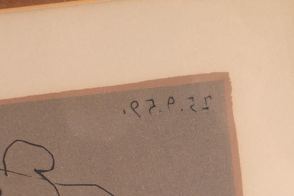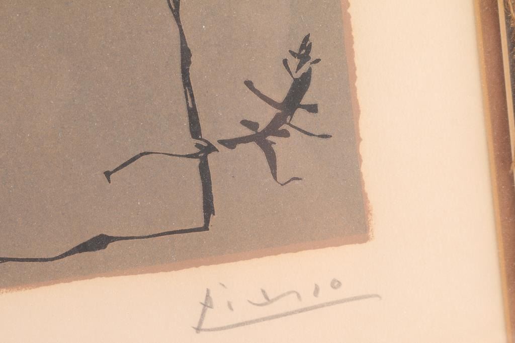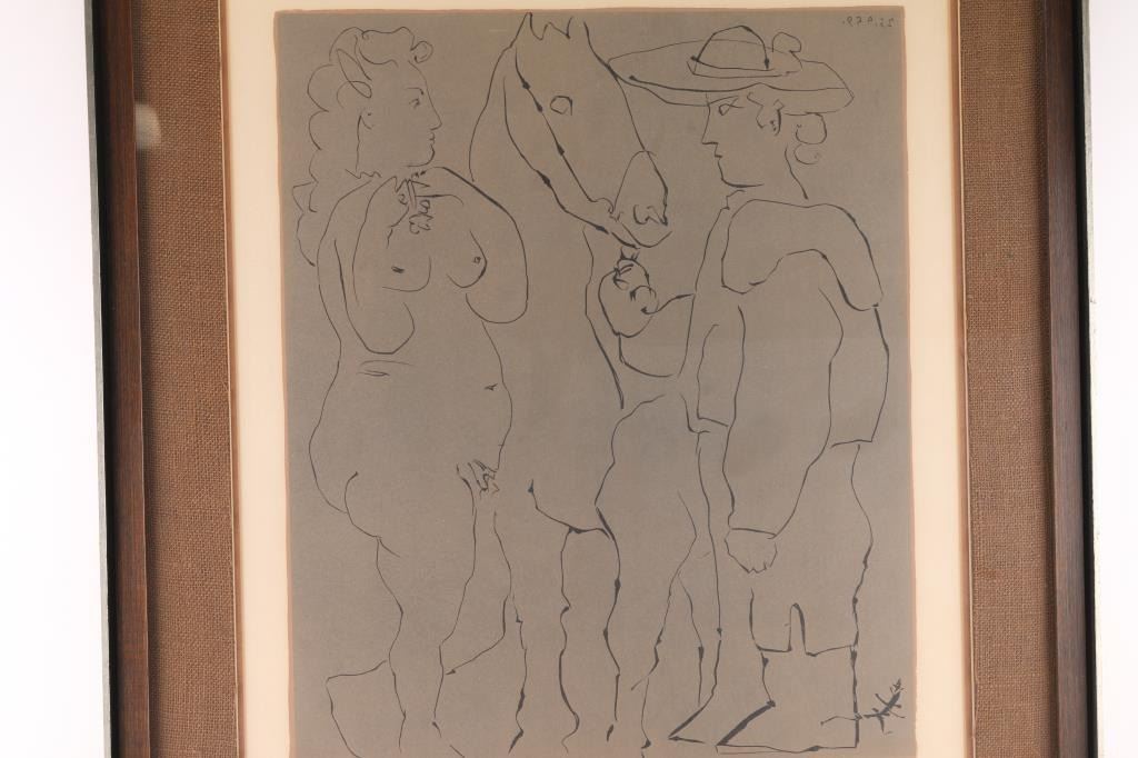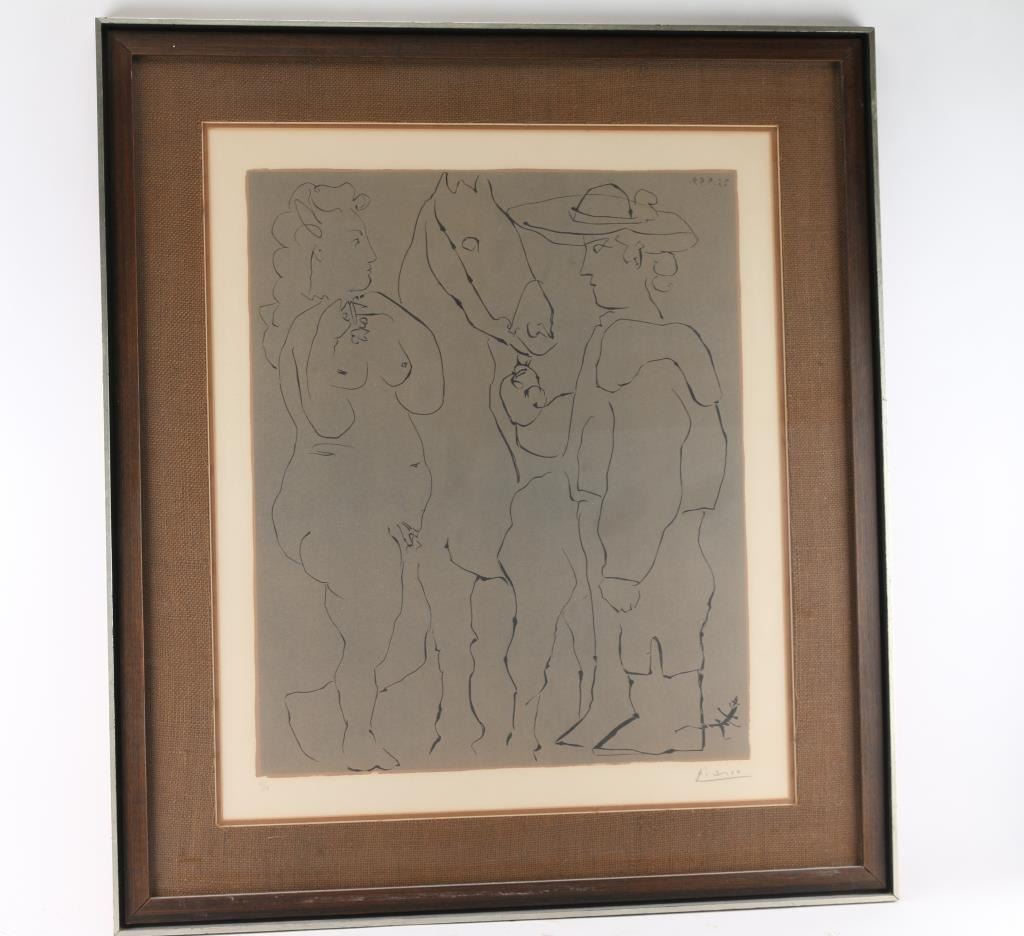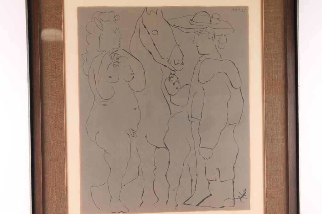 by famous artist Pablo Picasso, original linocut #13/50 hand signed and numbered in pencil. Entitled Picador , Femme, Cheval. 24"x28" double matted and framed.From a Prescott estate.