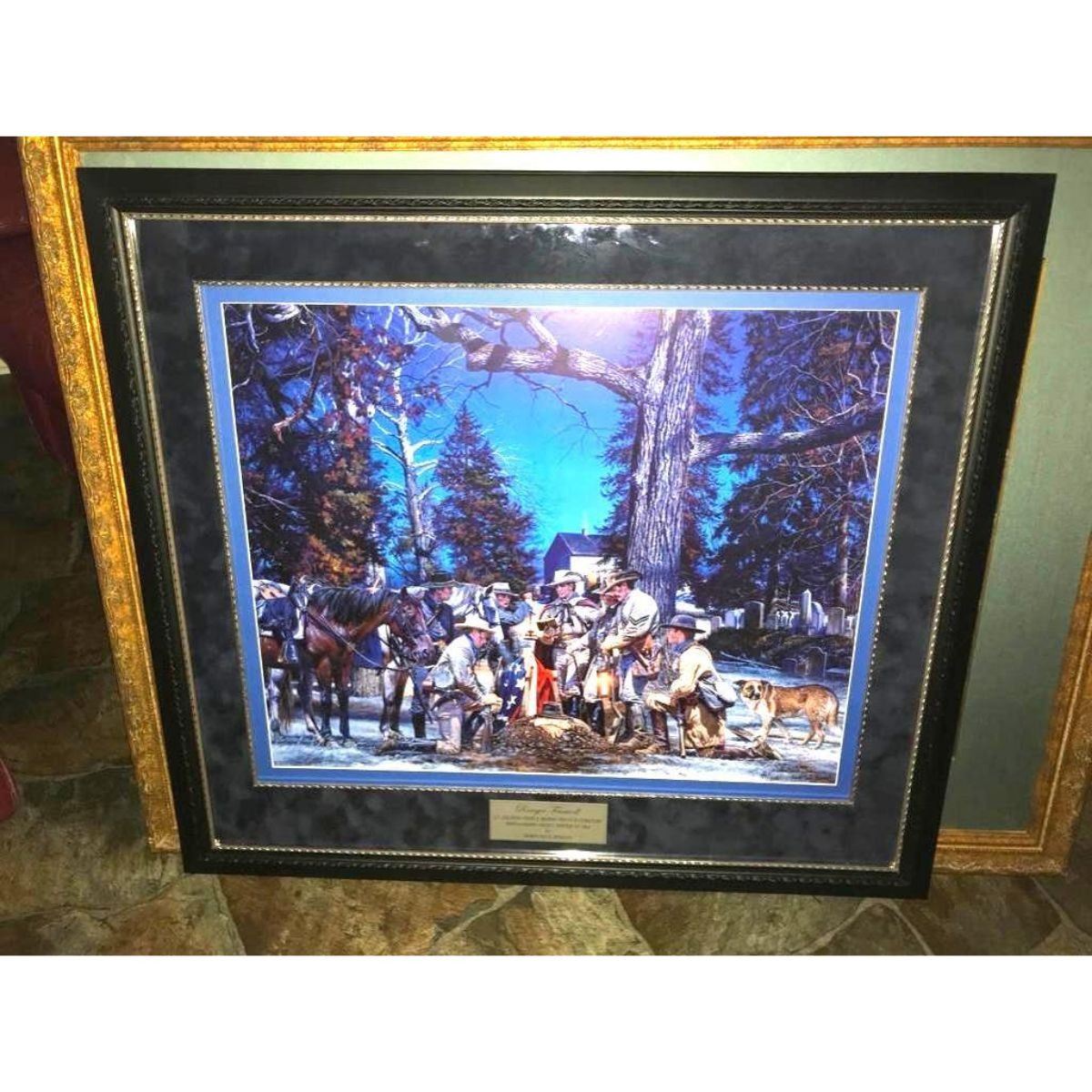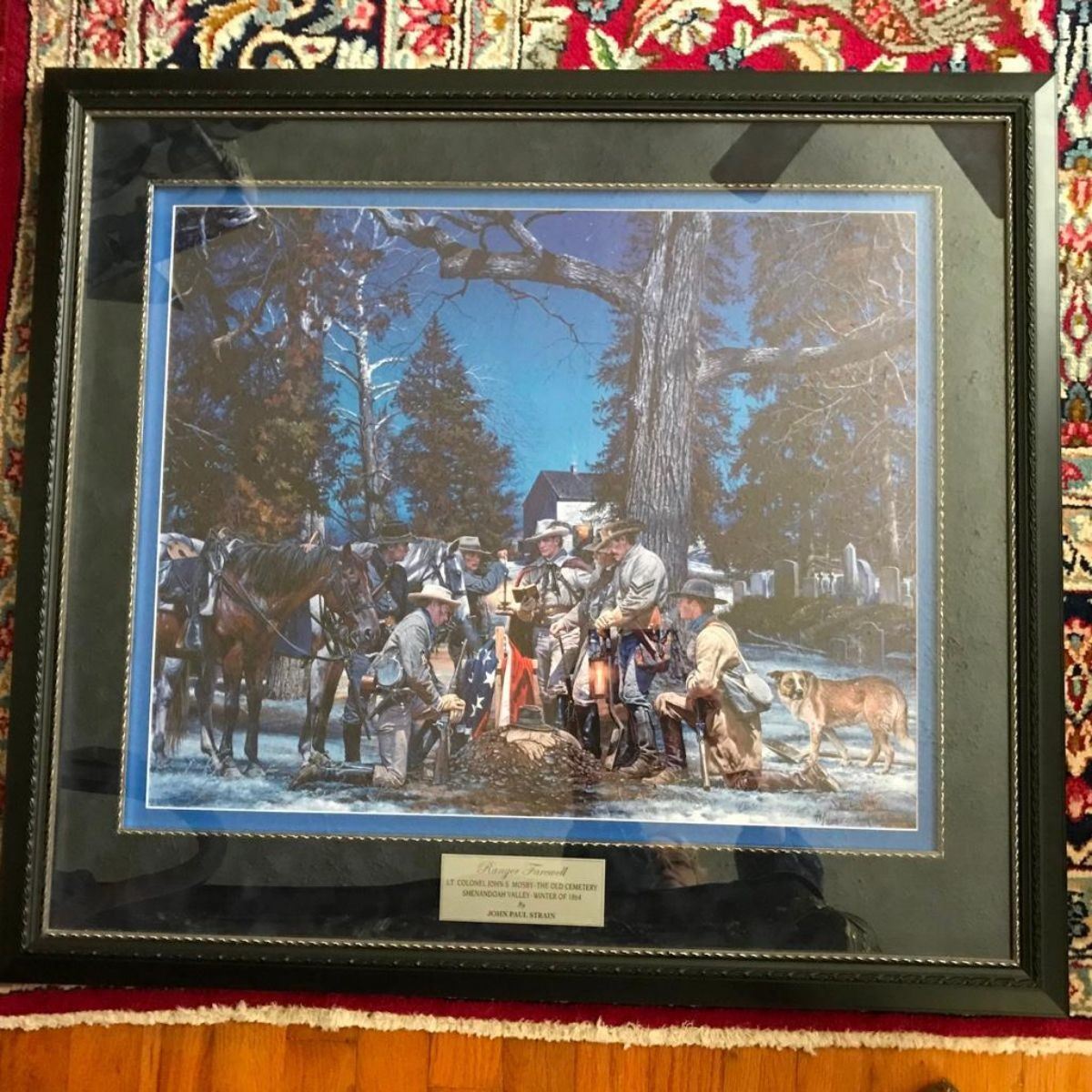 One of Mr Strains favorite subjects was John S Mosby & his Rangers throughout their fighting in the Shenandoah Valley in 1864-65. This lithograph is of his famous paintings of General Mosby & fellow Rangers attending a clandestine nighttime funeral & Old Chapel Cemetery in the Valley for one of his fallen troopers. It is a 19" x 24" offset lithograph, professionally matted & framed, from a limited edition of 350 prints. Signed by the artist  & numbered, lower right, 99/350.Â