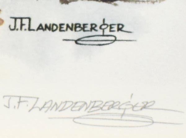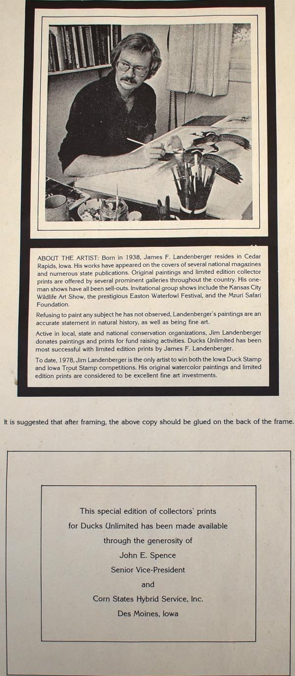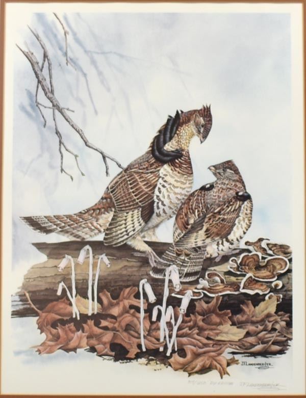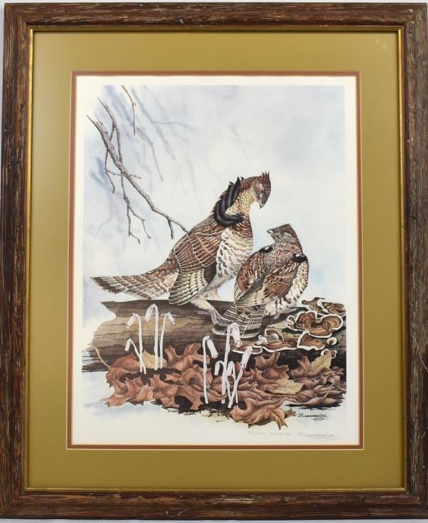 Limited Edition Framed ''Grouse'' Print by J.F. Landenberger (1938-2003), # 814/1250, hand signed and numbered by the artist, visual measures 16'' x 20'', overall framed measurement of 24'' x 28'', this Ducks Unlimited special edition print was made available through the generosity of John E. Spence and Corn States Hybrid Service, Inc., FYI: ''Wildlife artist James F. Landenberger (1938-2003) was the first three-time winner of the Iowa outdoor stamp design contests; his original watercolors and limited-edition prints are a lasting legacy to his craft.''