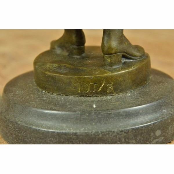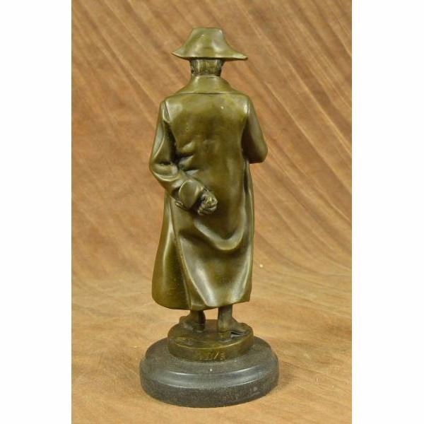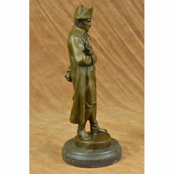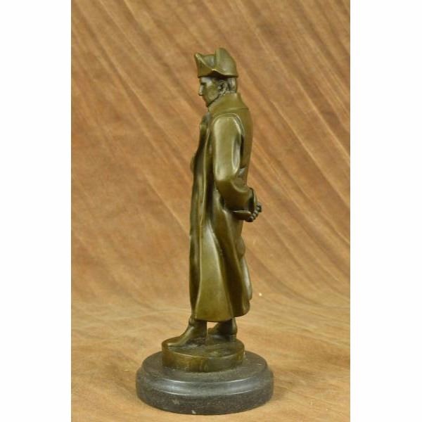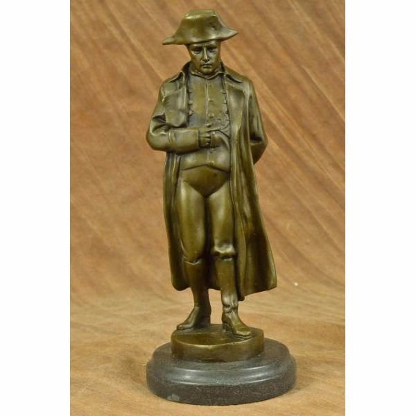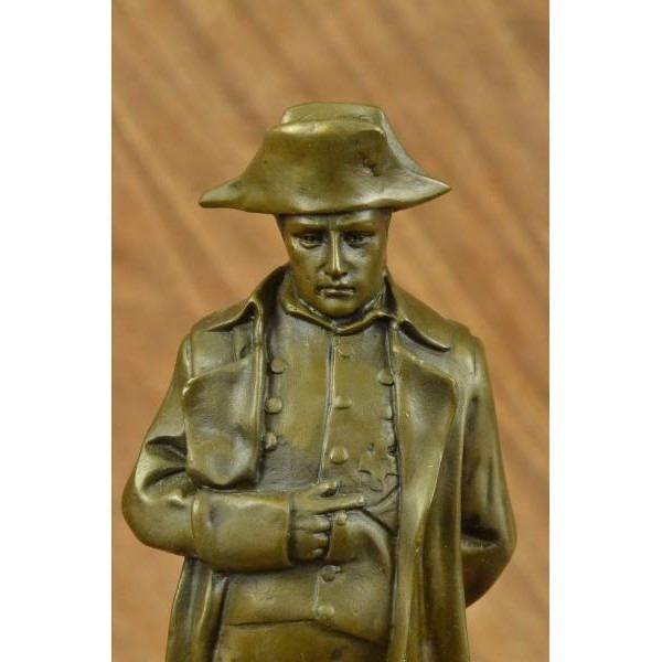 This is a bronze limited edition honoring the French commanding martial giant Napoleon Bonaparte (15 August 1769 5 May 1821). As Napoleon I, he was Emperor of the French from 1804 to 1815. His legal reconstruction, the Napoleonic code, has been a major influence on many civil law administrations worldwide, but he is best remembered for the wars he led against a series of coalitions, the so-called Napoleonic Wars, during which he established dominion over much of Europe and sought to spread revolutionary ideals. The beholder witnesses him standing straight ahead with proudness, his fanning fortune after all, finally defeated at the Battle of Waterloo in June of 1815. The sculpture was cast using the archaic method of lost-wax casting and stained with a brown patina finish for perpetuation, and is signed and numbered by artist Milo. Condition: This sculpture is in a perfect condition. Bronze Dimensions with Marble Base:Height 11" x Width 5" Marble Dimensions: Diameter 5" Height without base: 10" Weight : 6 LBS Inventory : 27STE3773272