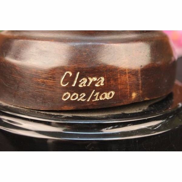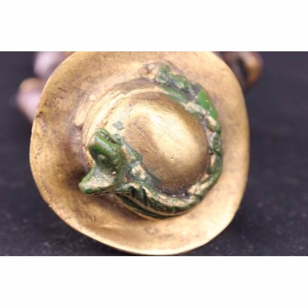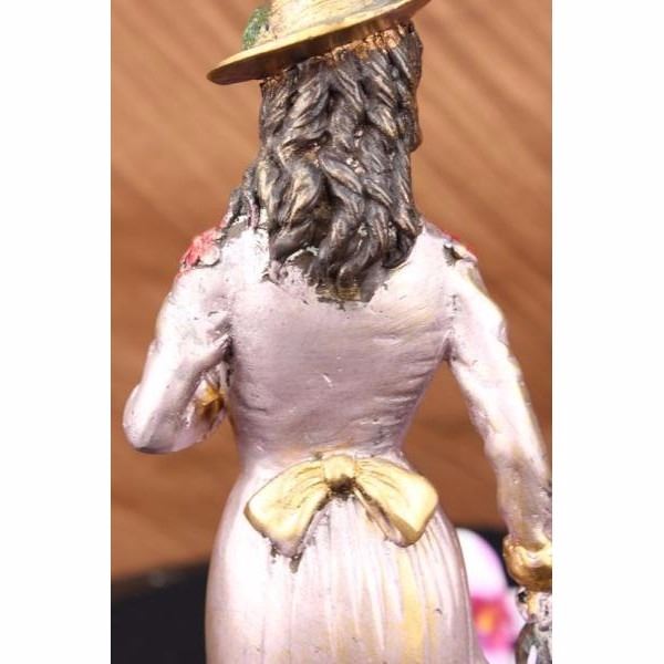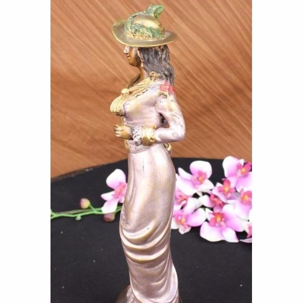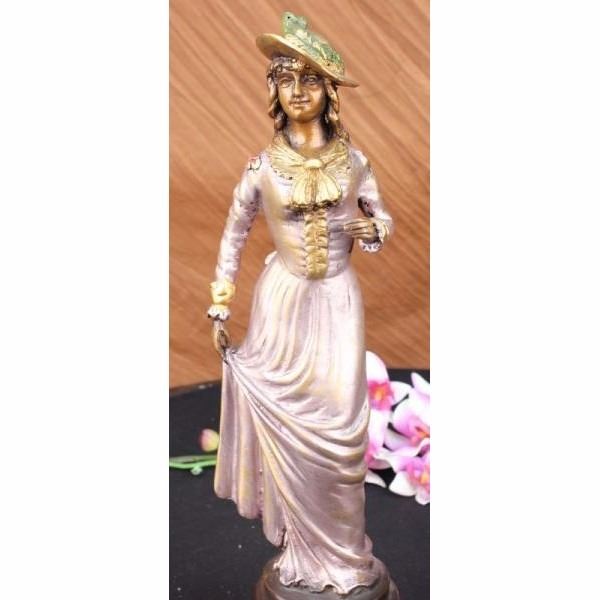 A fashion maven of the past, strolls the streets and gains the attention of many admirers. She wears a long-sleeved corset with a long sleek skirt. She elegantly lifts the hem of her dress from the ground as she walks. Her creme patina skirt matches the corset with the exception of a few subtle yellow details. She wears a sun hat that sits tilted to the side of her hair. She is a symbol of grace and style. 100% bronze and handmade, this sculpture was cast using the "Lost Wax Method" and mounted on a marble base and is signed Clara. Condition: This sculpture is in a very good condition. Bronze Dimensions with Marble Base:Height 13" x Width 5" Marble Dimensions:Diameter 4" Height without base: 12" Weight : 6 LBS Inventory 74-25080M6847