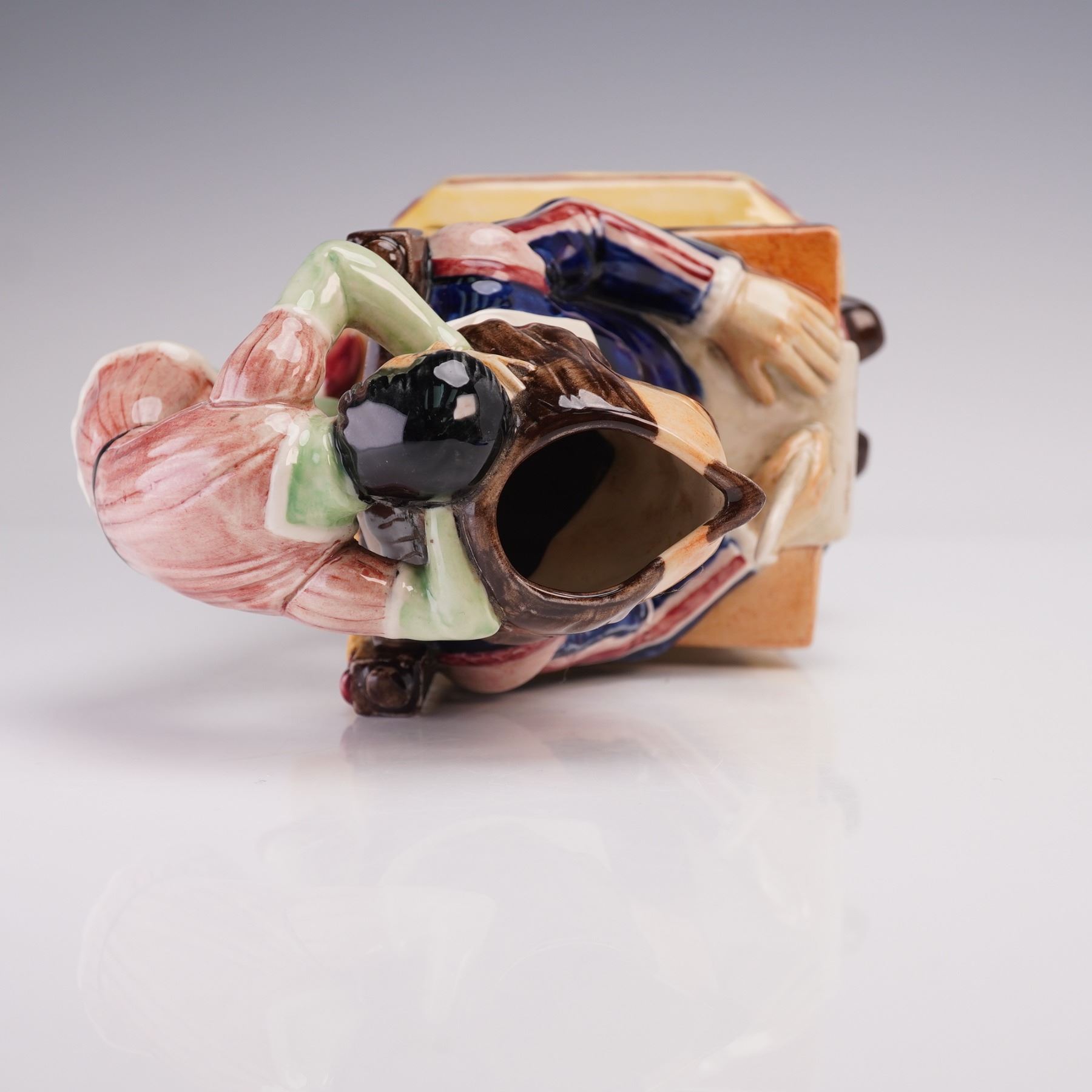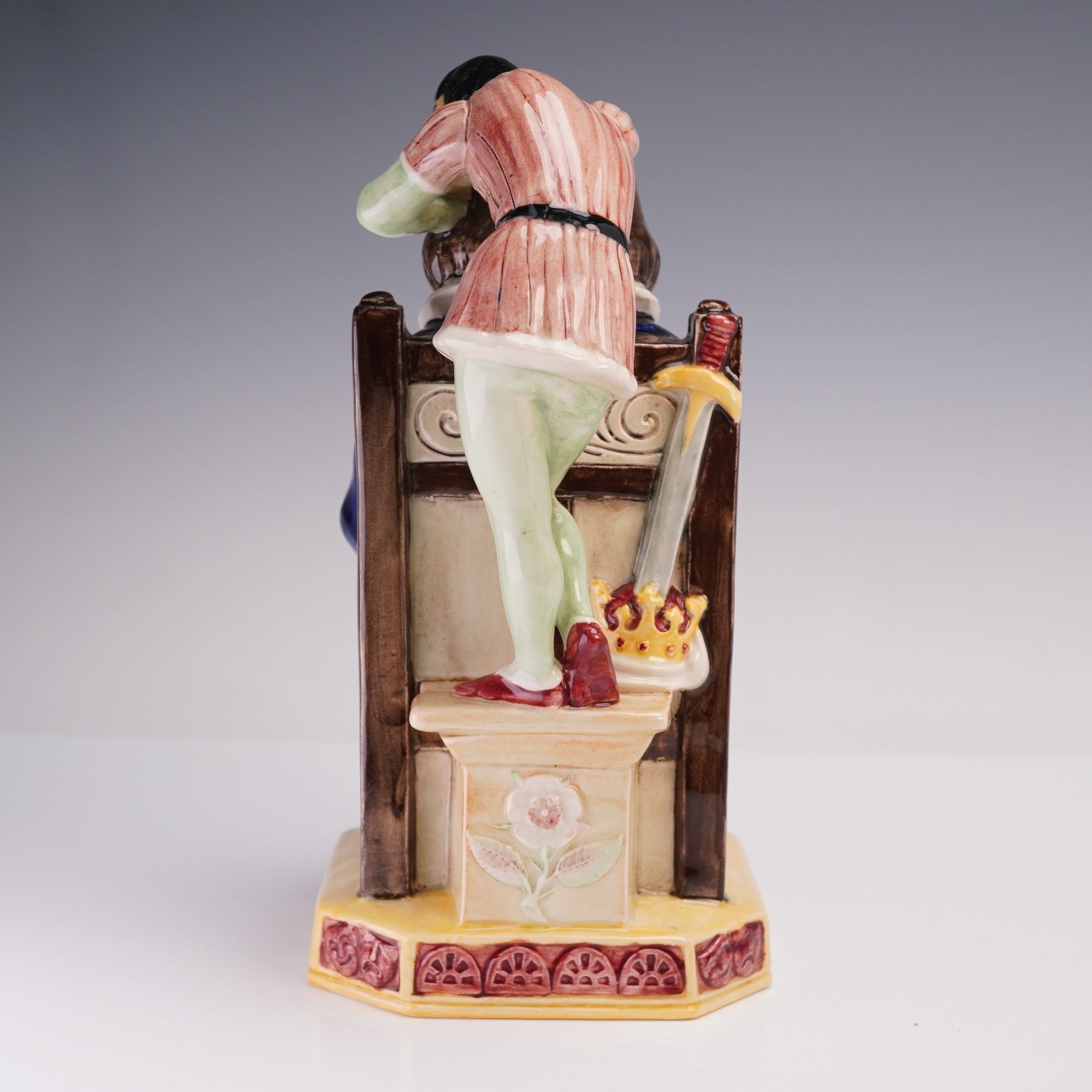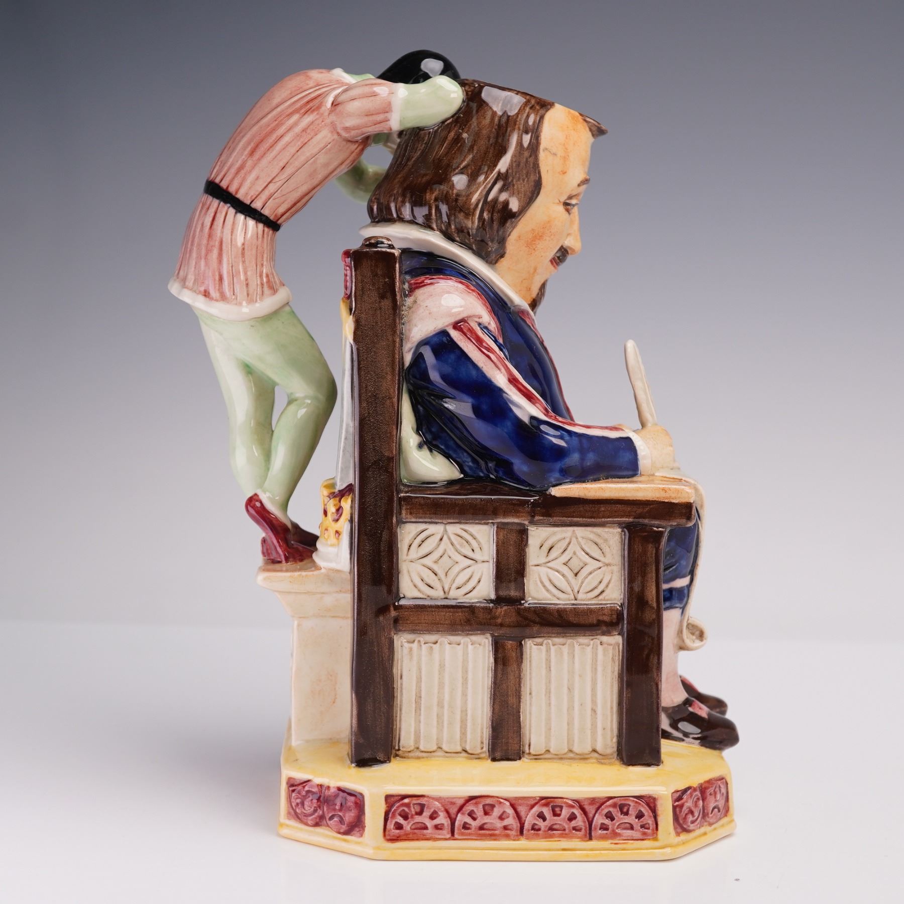 A finely detailed figurine depicting William Shakespeare seated at his writing desk with quill in hand, a jester perched playfully behind him. Hand painted in rich colors and marked to the base. Kevin Francis Ceramics backstamp. Marked 269 of 1000.