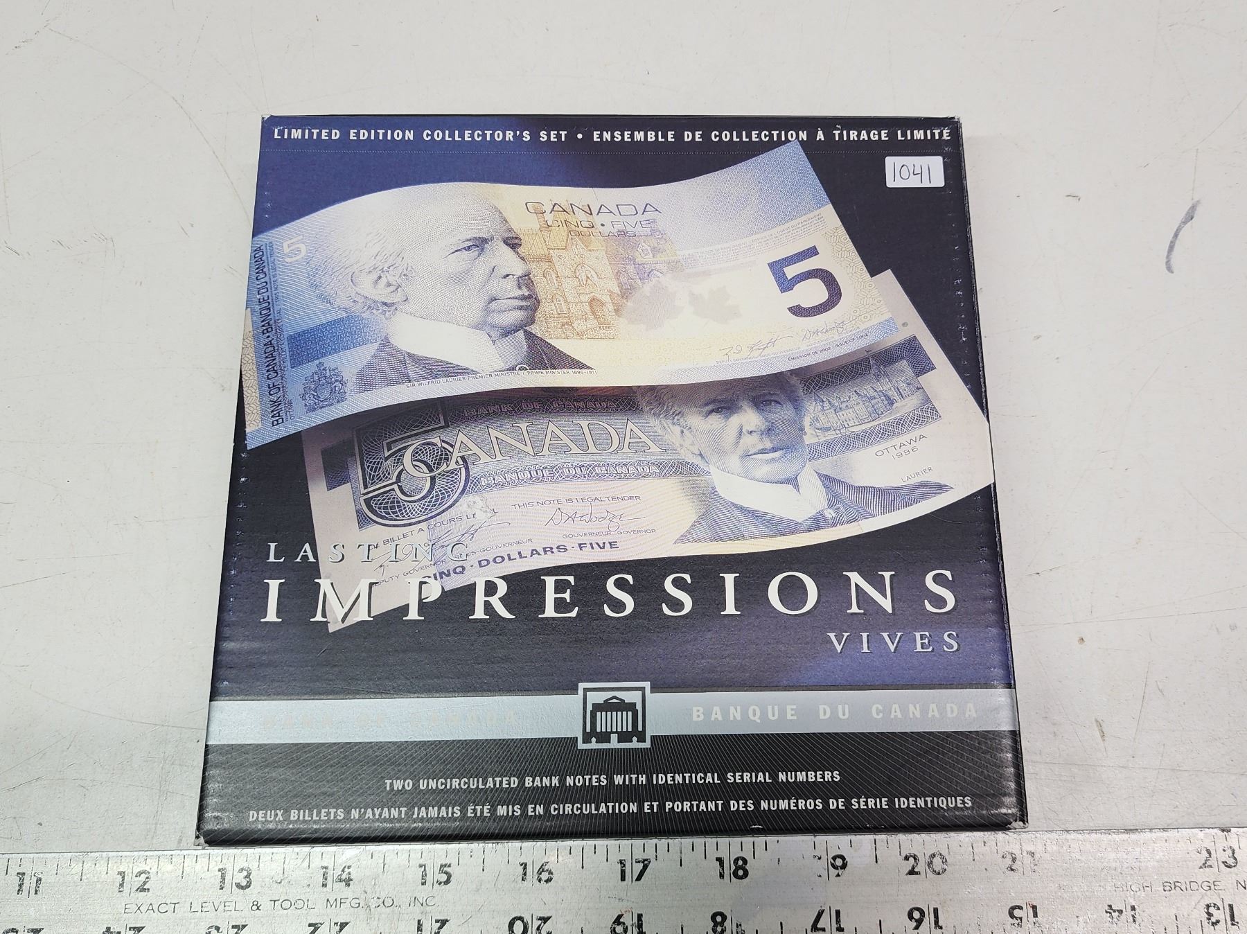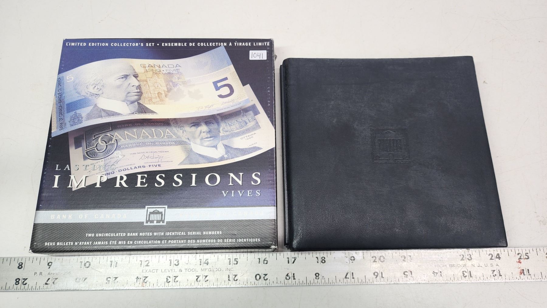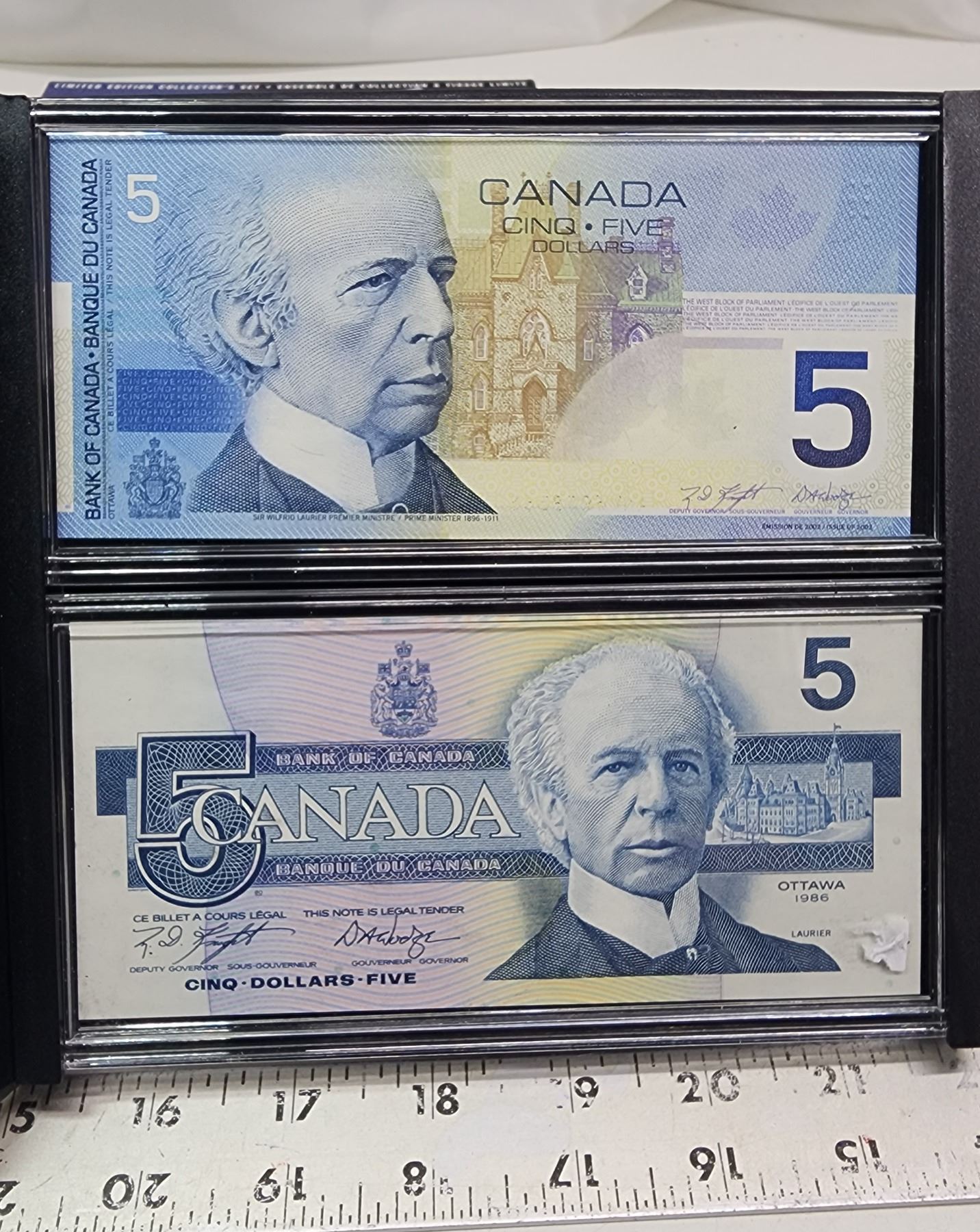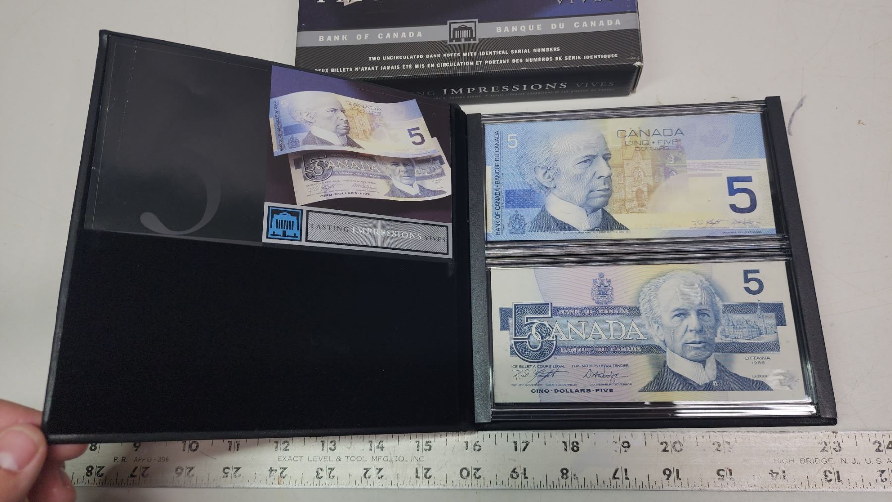 Limited Edition "Lasting Impressions" Dual 1986 & 2002 uncirculated Canadian 5 dollar bills - matching serial #'s - ANU 6958360