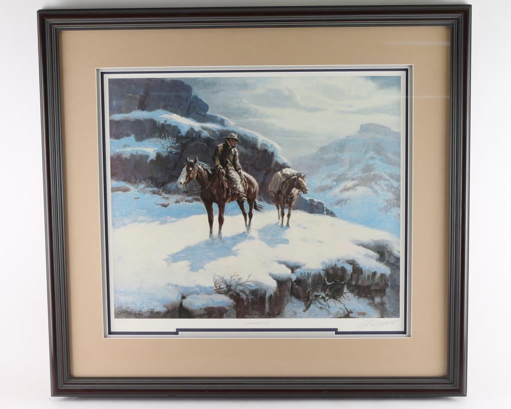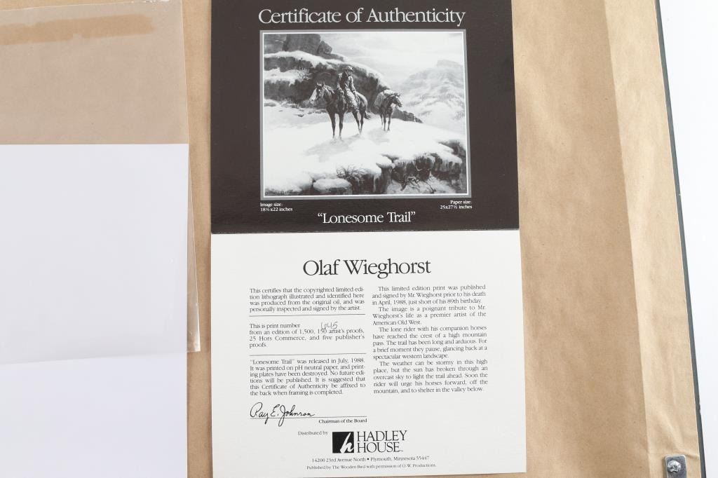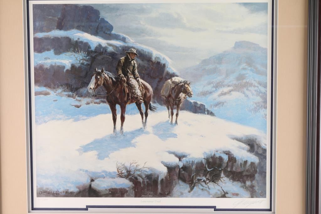 By well known artist "Olaf Wieghorst" entitled "Lonesome Trail" signed and numbered 645/1500. Image size measures 18.5x22. Framed and triple matted.