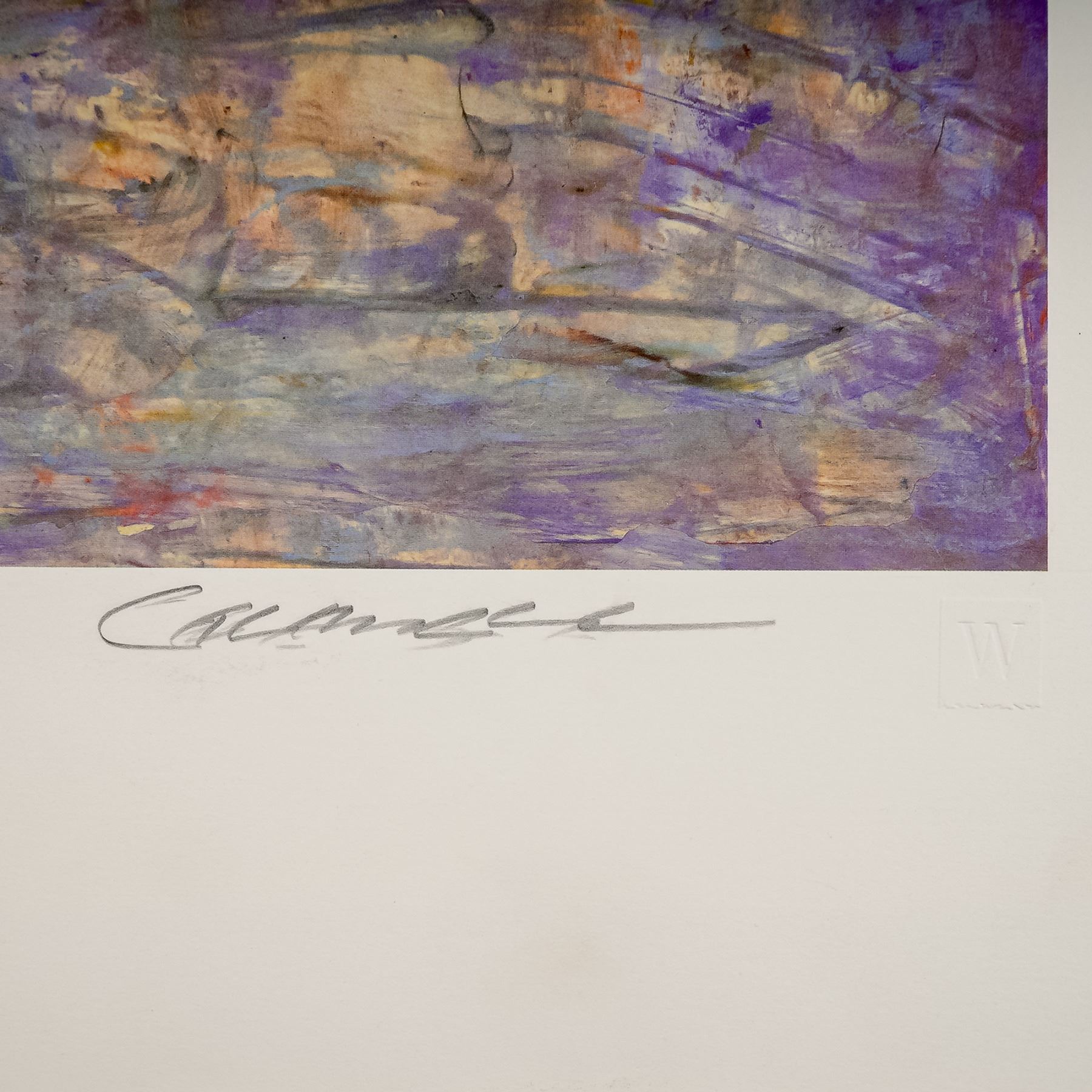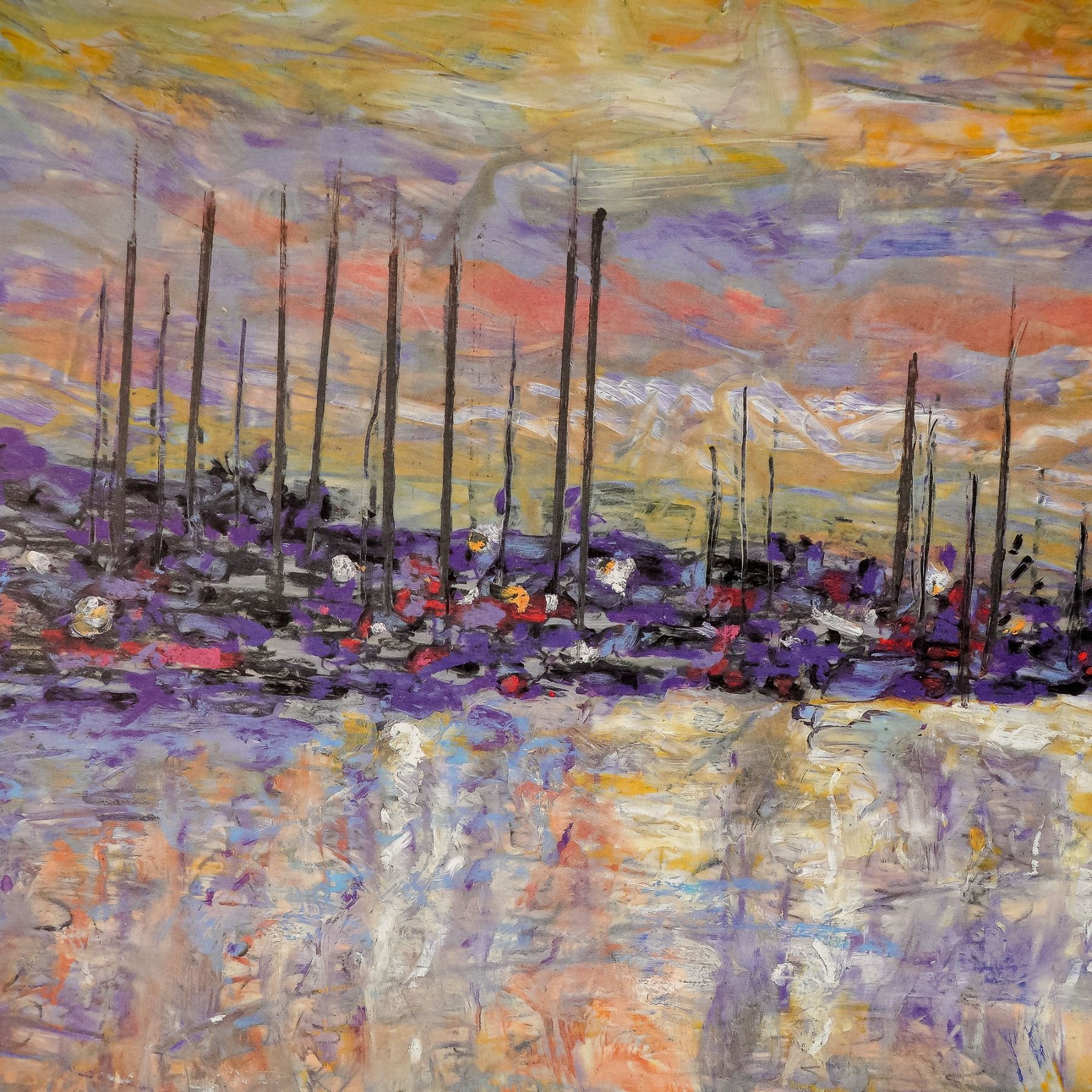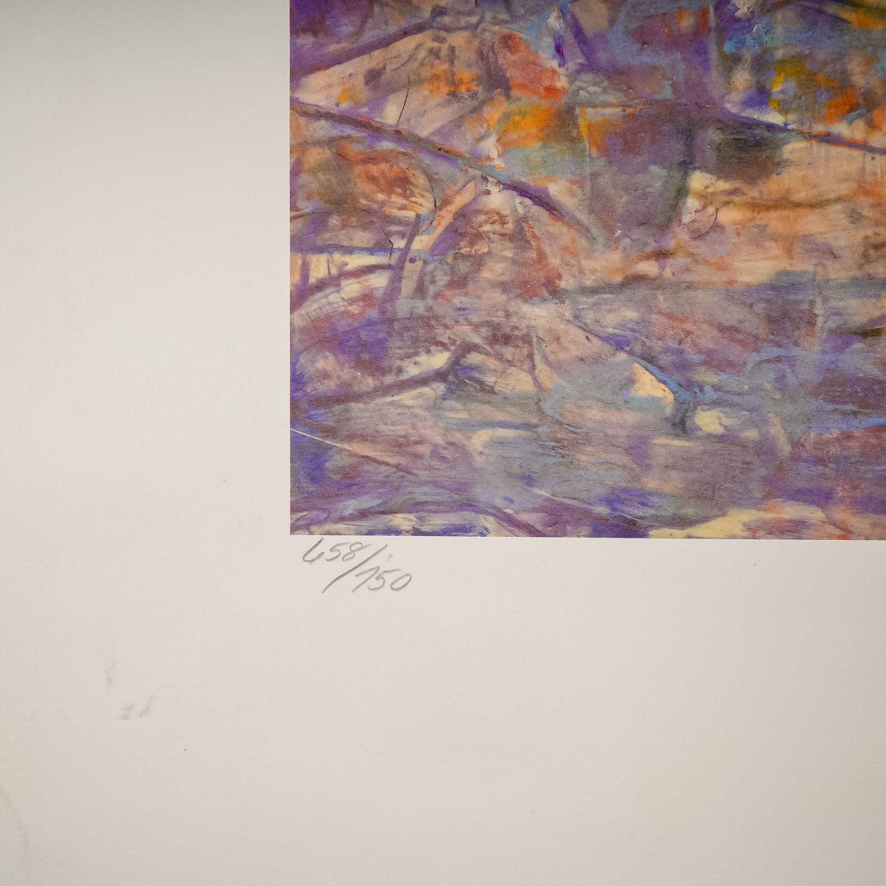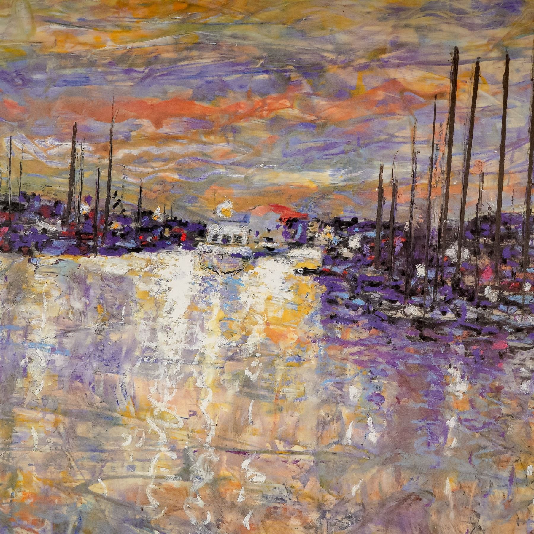 A spendid limited edition lithograph on paper depicting a harbor at sunset, alive with reflections of sailboats and glowing skies rendered in sweeping strokes of purple, gold, and orange. This striking piece captures the energy of impressionist influence, blending atmosphere and movement into a dynamic waterfront composition. The use of bold color and rhythmic brushwork creates a captivating visual rhythm that immerses the viewer in the scene. The work bears the artist's signature lower right and is hand-numbered 658/750 at the lower left.