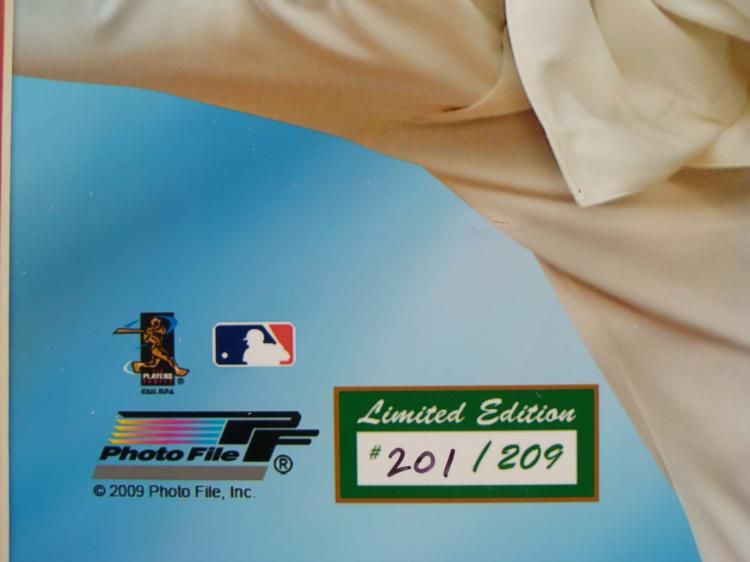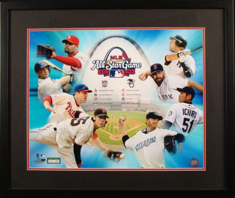 In 2009, St. Louis was the lucky city to host the All-Star game. Offered here is a 21 1/2" x 25 1/2" framed, orange and black matted, photographic collage of the some of the headline players who competed in the 2009 All-Star game. Such names are Albert Pujols, Chase Utley, Derek Jeter, Ichiro Suzuki, and more. The players are either fielding a routine grounder, throwing a wicked strike, or swinging for the fences. The photograph is of a limited edition, 201/209, has a MLB hologram at the bottom right, and is in mint condition. There is a wire on the back of the frame, that comes with a hook and nail for hanging.