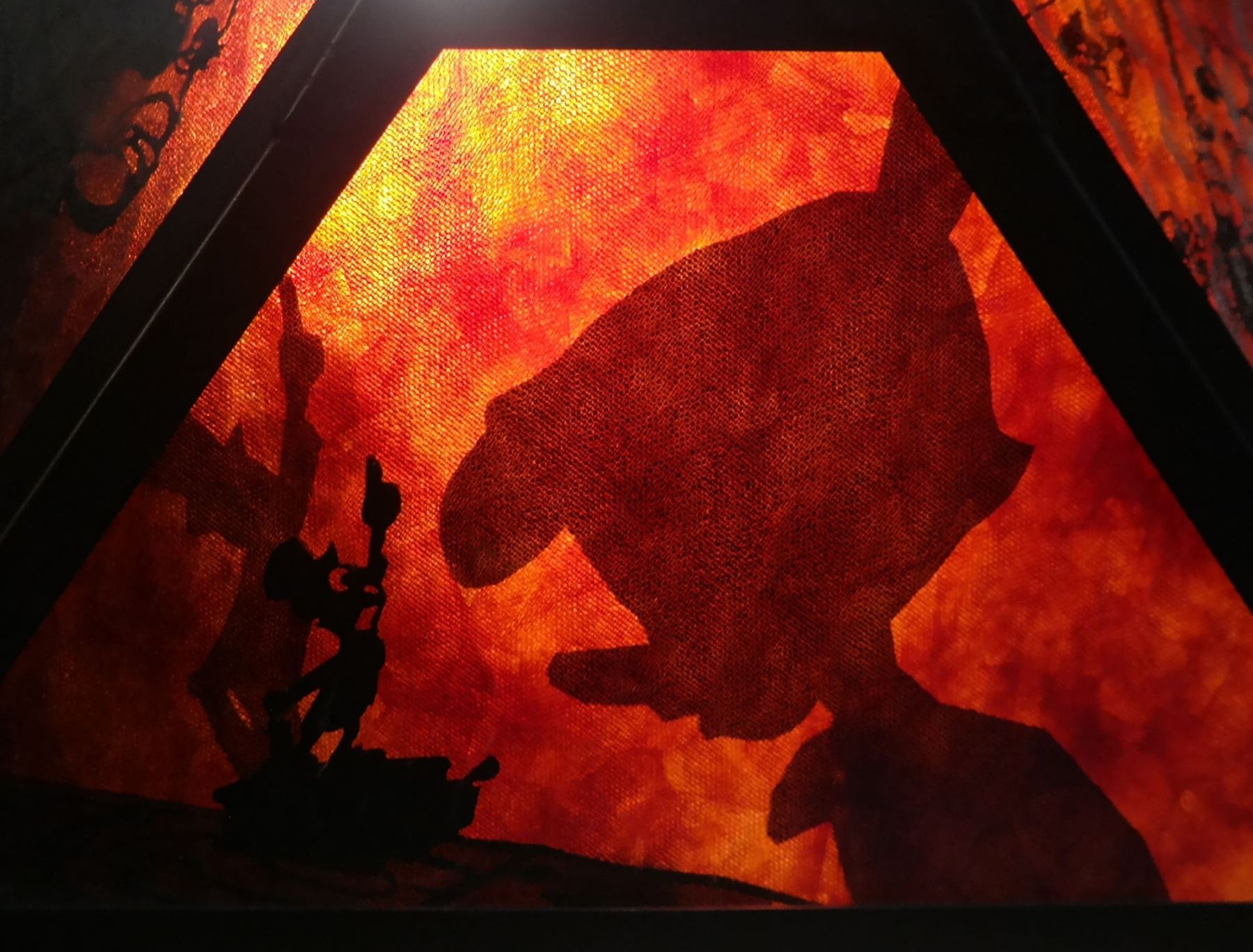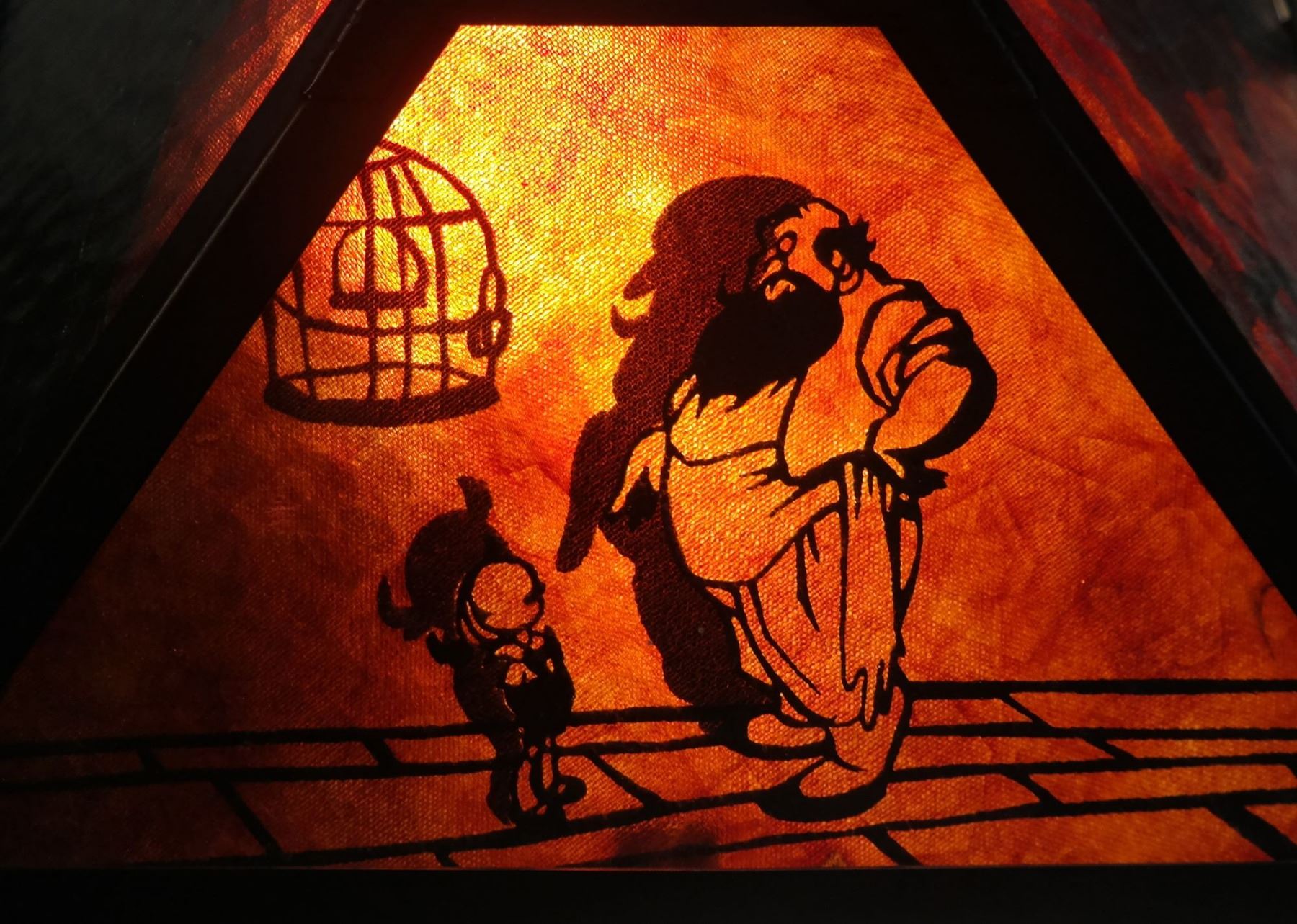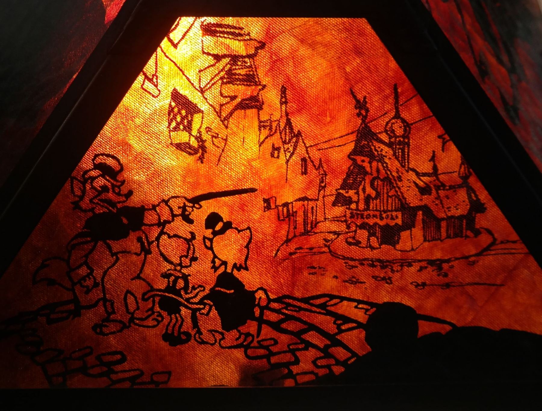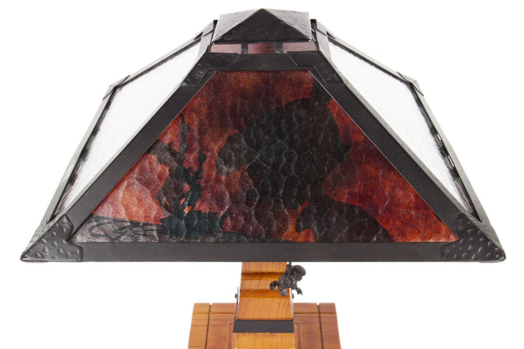 (Walt Disney Studios, c.2008) A wonderful craftsman style lamp themed after Walt Disney's Pinocchio. Titled "Pinocchio's Journey Table Lamp," the lamp was created by Jody Daily and Kevin Kidney in an edition of only 750. The lamp can be turned on and off by a Jiminy Cricket pull cord and the glass lamp shade features designs inspired by scenes from the film. Measuring 14"x14" and 17" tall, the lamp is in good condition overall with some wear from previous display including a few small scufss and nicks. The lamp functions very well and includes the original Certificate of Authenticity.