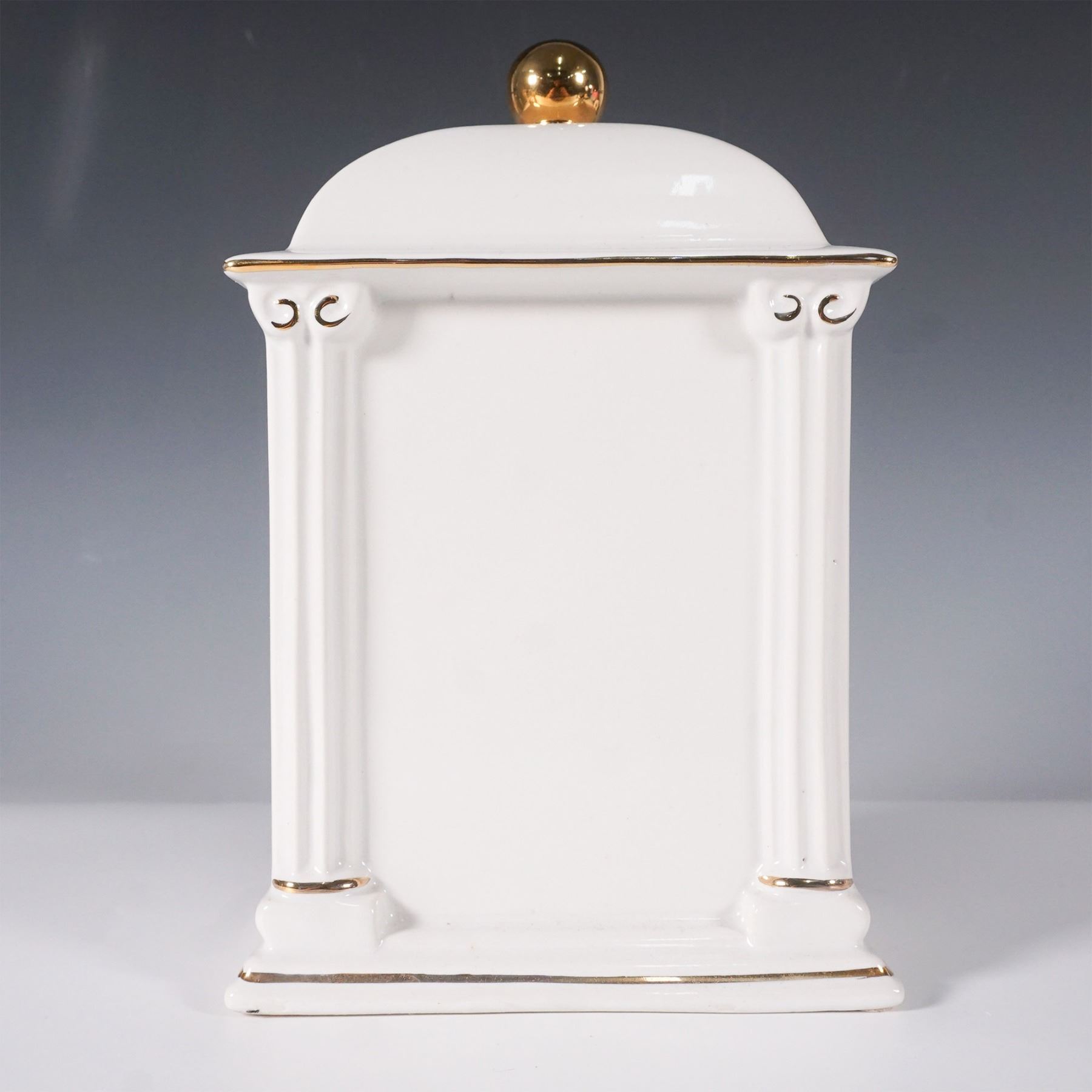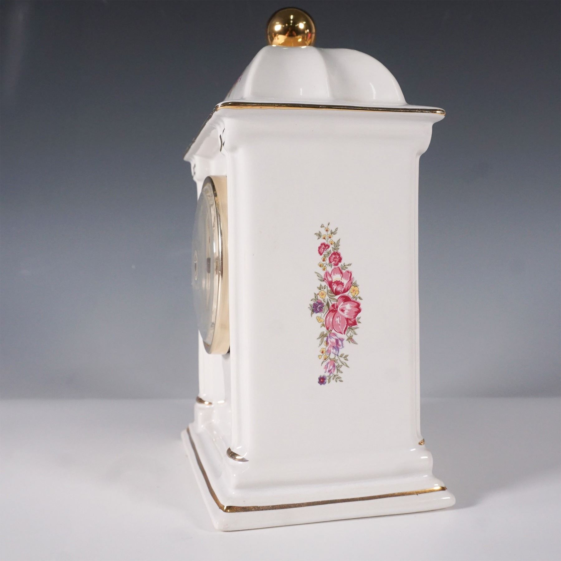 Elegant limited edition porcelain mantel clock by PS, issued in 1993. This classically inspired timepiece features a white porcelain body adorned with gold accents and a floral motif. The clock face showcases Roman numerals with a quartz movement encased in a brass-tone frame. The architectural design is enhanced by column details and a domed top with a gold finial. The underside bears the PS limited edition mark.
