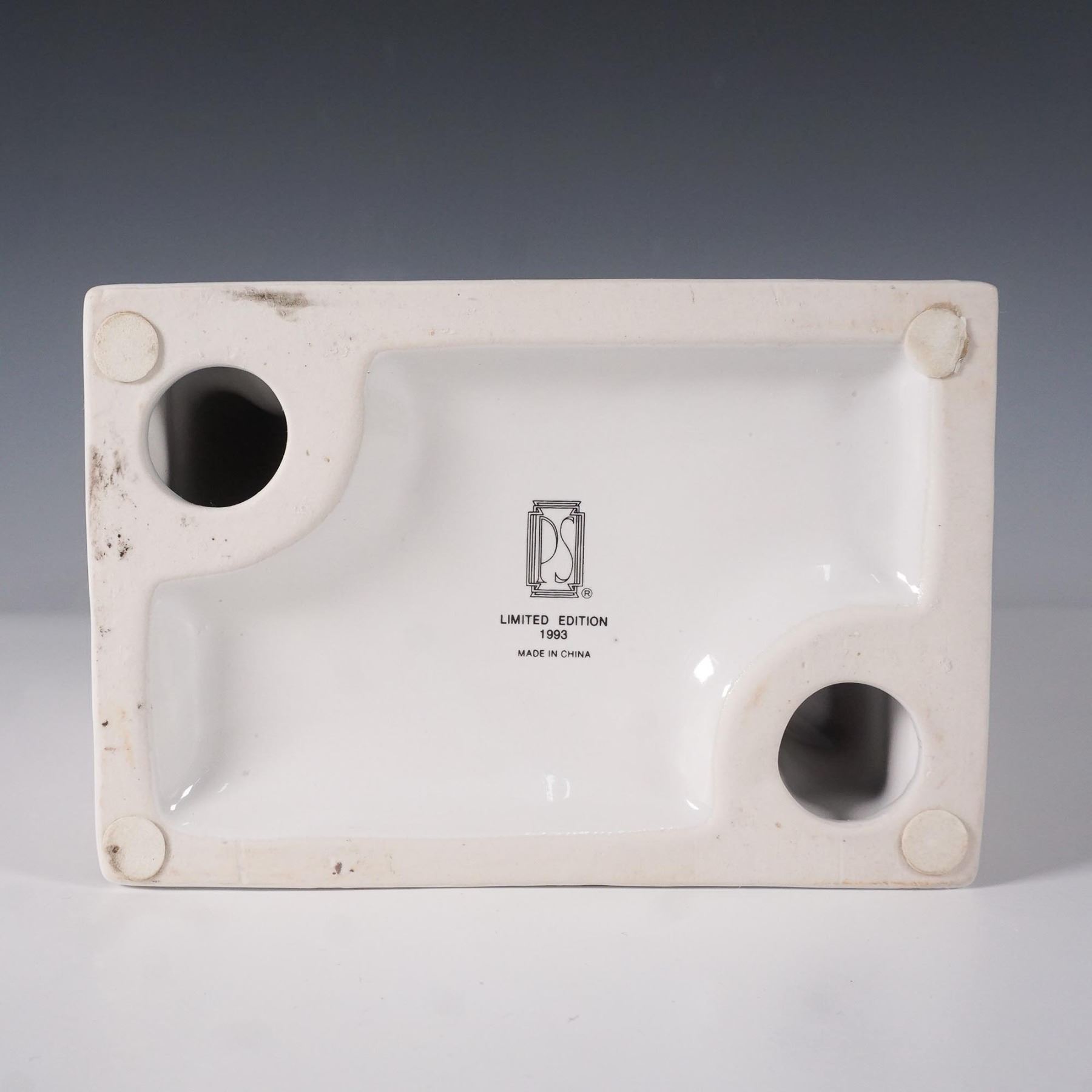Elegant limited edition porcelain mantel clock by PS, issued in 1993. This classically inspired timepiece features a white porcelain body adorned with gold accents and a floral motif. The clock face showcases Roman numerals with a quartz movement encased in a brass-tone frame. The architectural design is enhanced by column details and a domed top with a gold finial. The underside bears the PS limited edition mark.