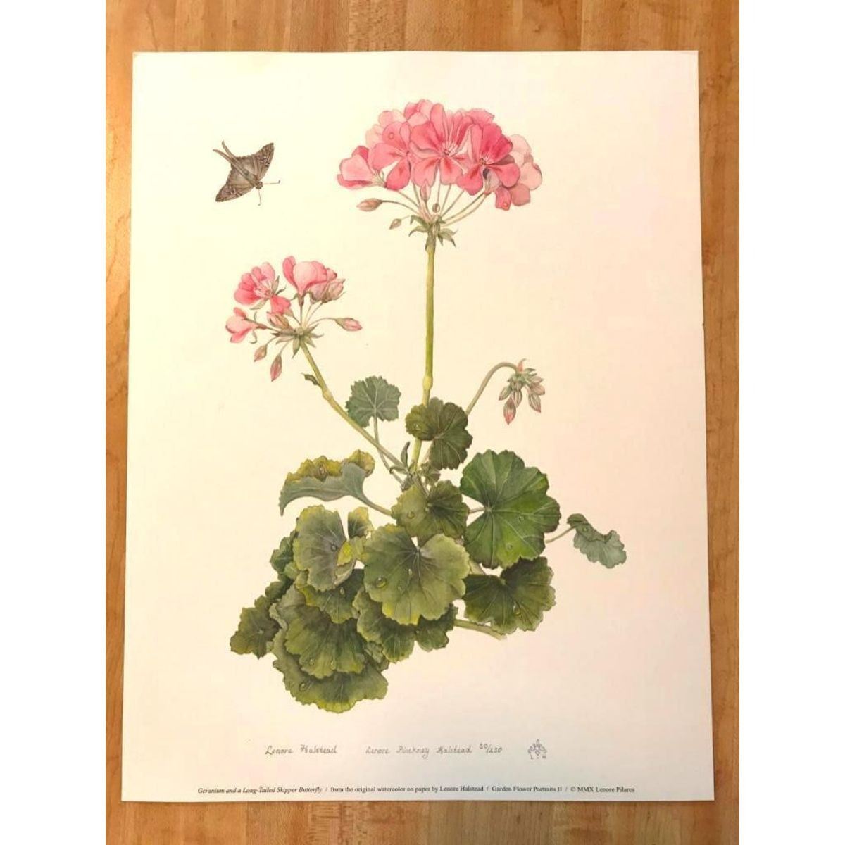 Lenore Pinckney Halstead Pilares, "Geranium and Long-Tailed Skipper Butterfly", from the original watercolor on paper by the artist, from her Garden Flower Portraits collection. # 50/ 250. 10" X 13". Comes with information sheet on the artist.