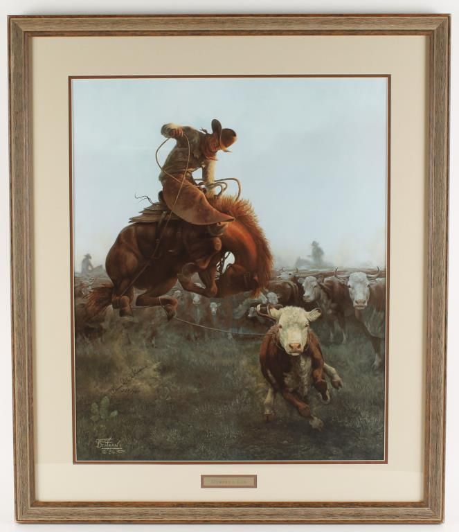 #229, framed and signed by the renowned True Western artist, Chuck DeHaan. The print is also known as "what can go wrong will go wrong" is an apt description of a "wreck" about to take place on a cattle roundup, and an impatient "cow hand" is about to painfully learn firsthand about "Murphy's Law". Measures 23 1/2"x17 1/2". Chuck De Haan is a sculptor and oil painter of present day cowboys in a traditional style. He has been interested in art since childhood. Self-taught at a young age, De Haan has also worked with horses for most of his life. During his rodeo career, he rode his first bull at age thirteen, and later specialized in bronc riding. He has done artwork for many Western magazine and catalog covers, and even headed up his own advertising agency for twelve years. Source: Harold and Peggy Samuels, "Contemporary Western Artists"
