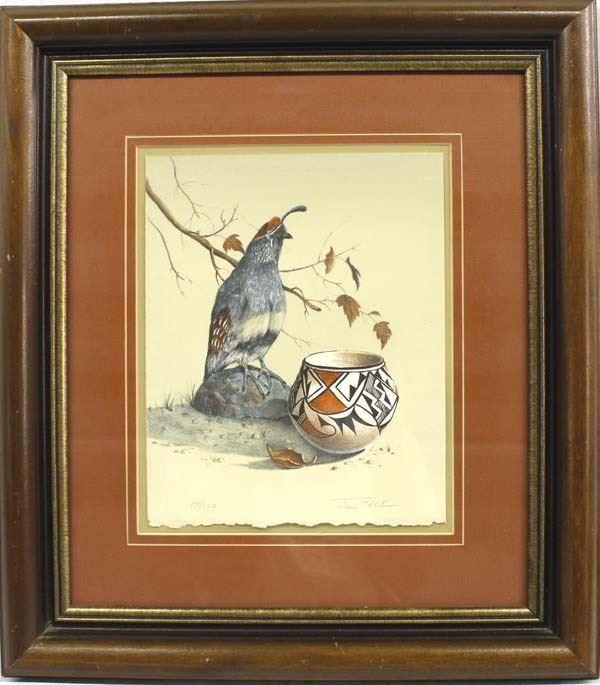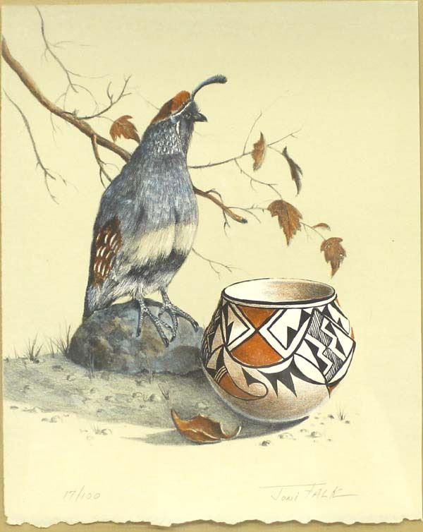 1980 Framed Limited Edition Print by Joni Falk (b. 1933) ''Desert Companions'', visual measures 8'' x 10'', framed measures 18.5'' x 16'', hand signed and numbered #17/100, FYI: ''Joni Falk realist painter of still life and landscapes, has lived in Phoenix, Arizona since 1960. Joni has become well known throughout the United States and Canada for her diversity of Subject from Traditional Floral still life's, Western still life's, Pueblo or Plains Indian Landscapes and Indian Figures.''