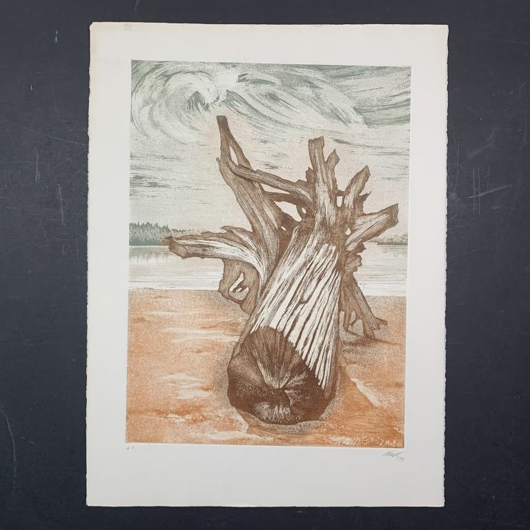 A limited edition print, signed and dated lower right, and numbered AP. This piece is of a large fallen tree, on a sandy beach, at the water'sedge. This piece is in very good condition with some extremely minor wrinkles at top, and minor crease upper left corner.