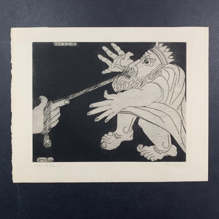 A limited edition print signed lower right and numbered Artists Proof lower left. This piece is of a hand pulling a king, by way of a rope attached to the king's nose ring. This piece is in excellent condition.