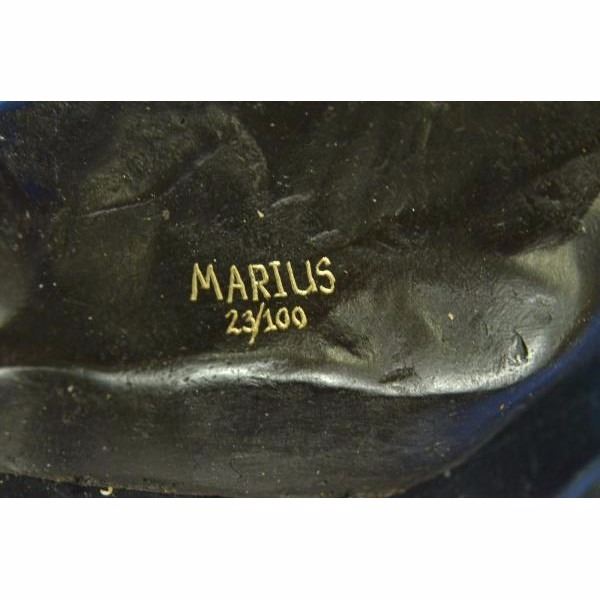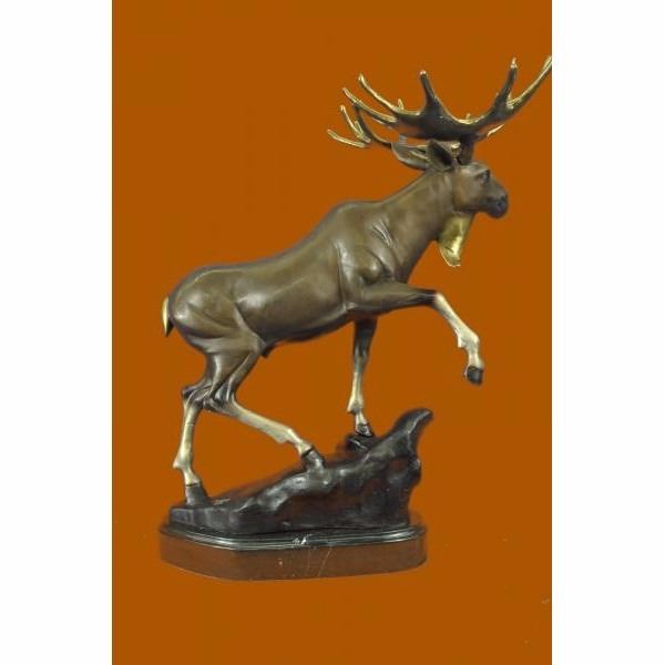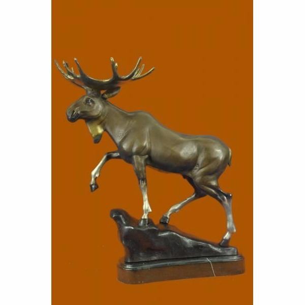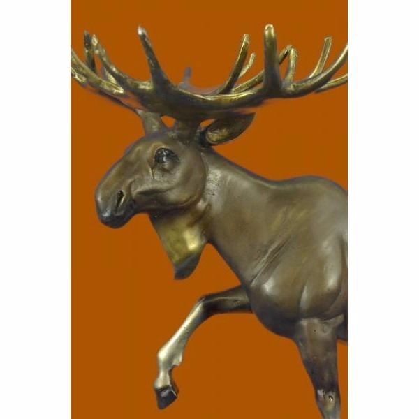 This bronze sculpture depicts a moose eating the wet grass from a lake. He bends down into the water keeping his hind legs on high dry ground just in case anything decides to attack or he needs to get out of the lake in a jiffy. His antlers are majestic and his face is cute and kind. This herbivore is a gentle giant and lives in some of the most beautiful landscapes one could possibly imagine. This bronze sculpture was cast using the Lost Wax Method and has a brown and silver color patina. It is mounted on a marble base and is handmade. This Limited Edition sculpture is signed and numbered by artist Marius. Condition: This sculpture is in perfect condition. Bronze Dimensions with Marble Base:Height 20" x Width 22" Marble Dimensions: Diameter 11". Height without base: 19" Weight : 21 LBS Inventory : 83-58534MTS12738