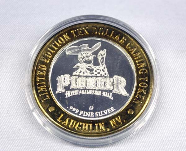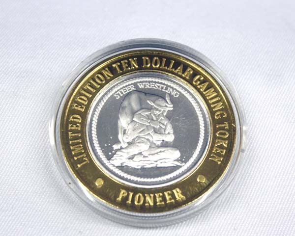 Limited Edition Ten Dollar Gaming Coin from ''Pioneer Casino'' in Laughlin NV, .999 Fine Silver, has ''Steer Wrestling'' on face of coin, 37.22g in total wt.