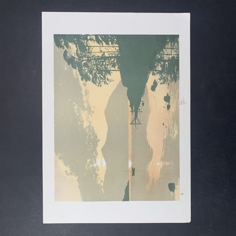 A limited edition print of a waterscene, looking out at a small boat and mountain range in the background, at dusk. This piece is in near excellent condition with a very small crease lower left corner, and a very minor wrinkle lower right corner.