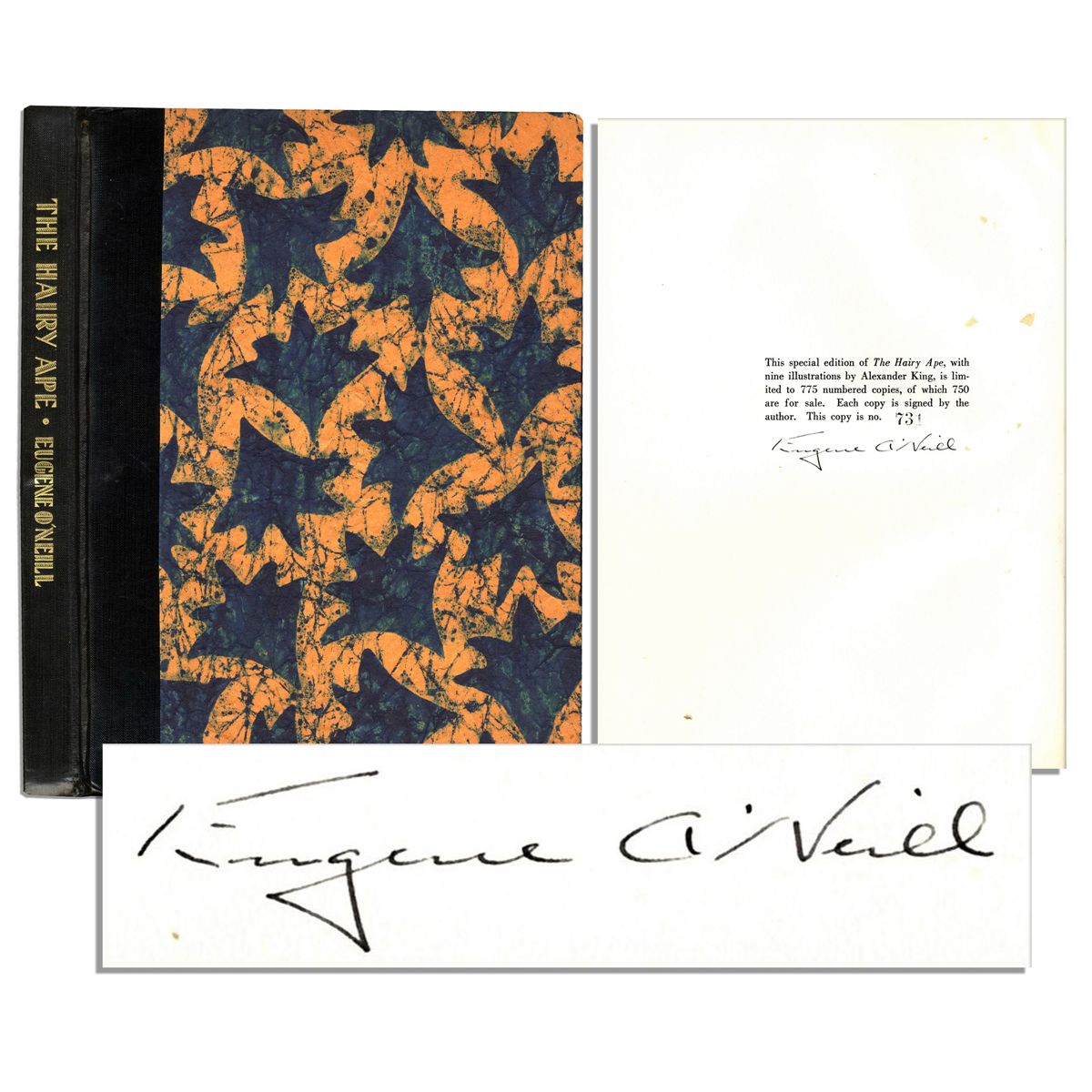 Eugene O'Neill ''The Hairy Ape'' limited edition signed. Published by Horace Liveright: New York: 1929, this is number 731 of 775 numbered copies of the play, of which 750 were for sale. Its limitation page is signed, ''Eugene O'Neill'' in black ink. This play is known as O'Neill's commentary on social class, about a manual laborer who is terrorized by his feelings of isolation. It was first produced in 1922 to widespread acclaim and earned a run on Broadway. Runs 114pp. and comes bound in blue and orange paper boards with a black cloth spine featuring gilt lettering. Deckled edges. Measures 8'' x 10.5''. Fine. Housed in its original black paper slipcase, that in fair condition.