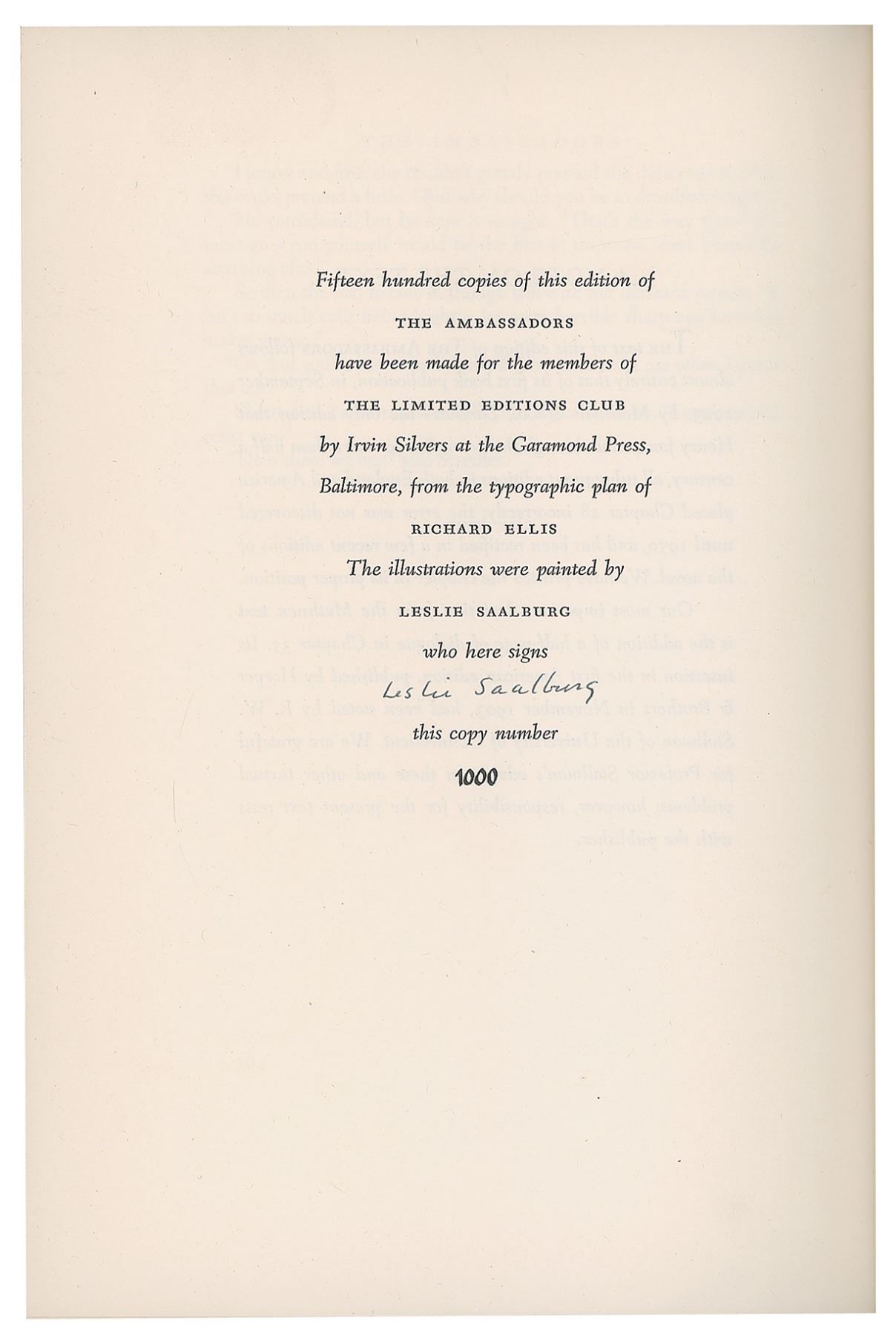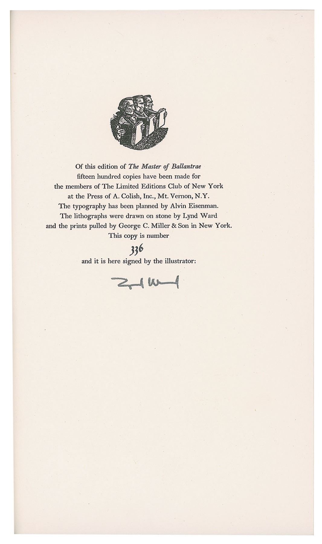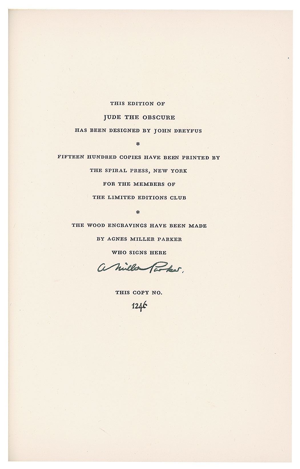 Three slipcased hardcover books published by the Limited Editions Club, each signed on the colophon by the illustrator: The Baster of Ballantrae by Robert Louis Stevenson, numbered 336/1500, signed by Lynd Ward; Jude the Obscure by Thomas Hardy, numbered 1246/1500, signed by Agnes Miller Parker; and The Ambassadors by Henry James, numbered 1000/1500, signed by Leslie Saalburg. In overall very good to fine condition, with some edge splitting to slipcases. Accompanied by an unsigned edition of The Divine Comedy of Dante Alighieri with engravings by William Blake, published by The Heritage Press in 1944.