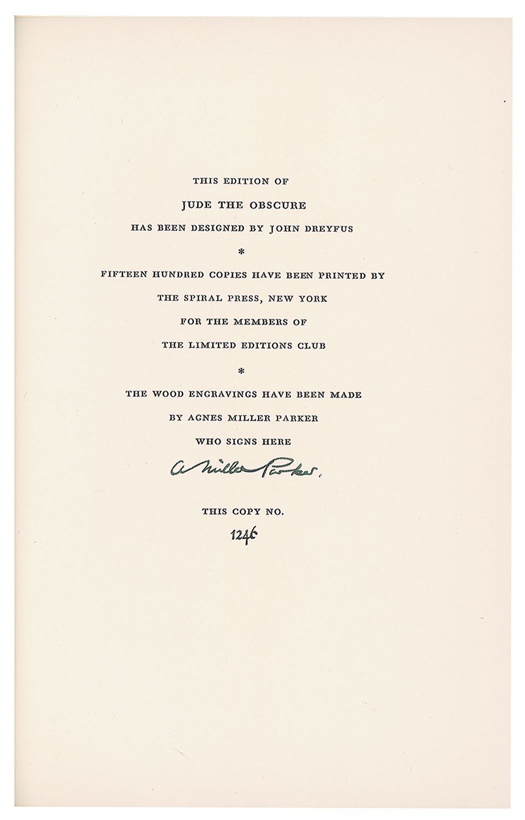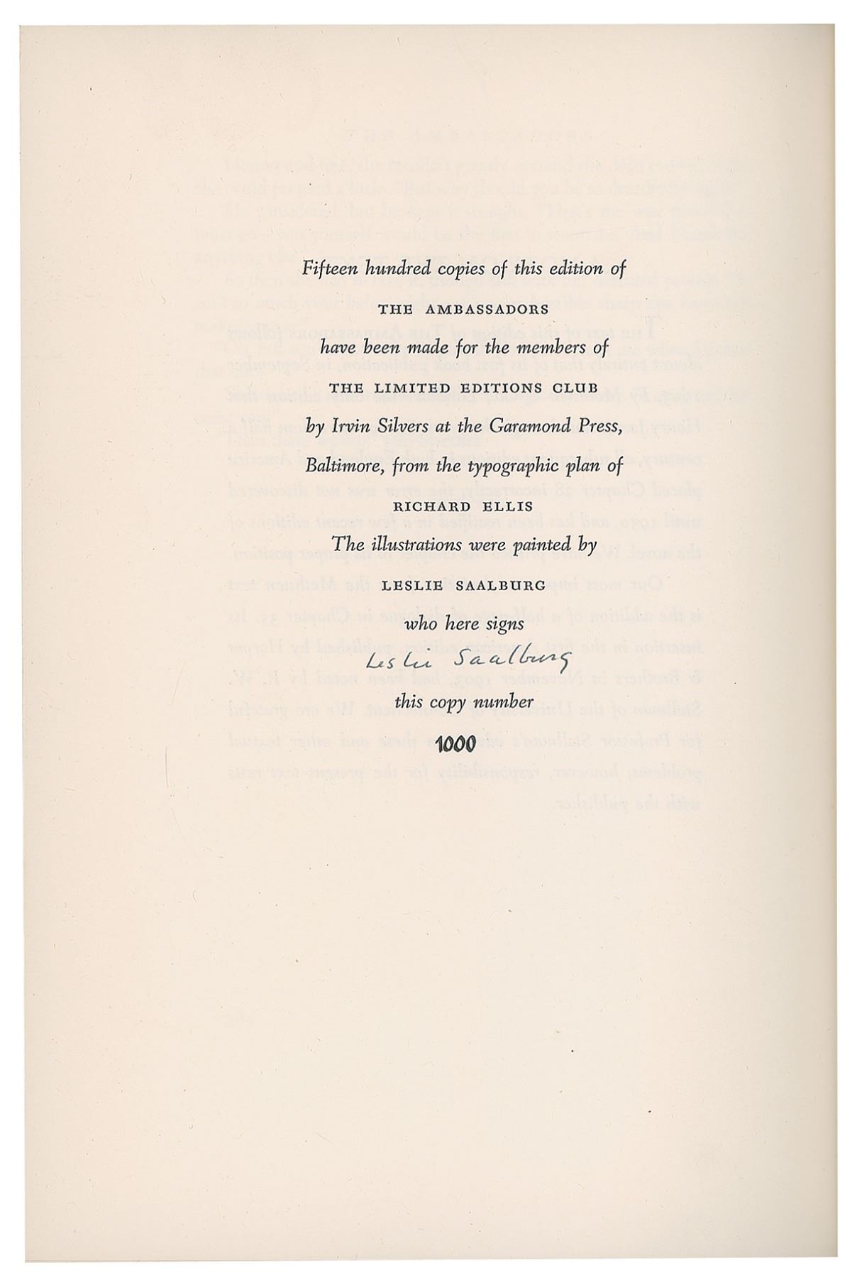 Three slipcased hardcover books published by the Limited Editions Club, each signed on the colophon by the illustrator: The Baster of Ballantrae by Robert Louis Stevenson, numbered 336/1500, signed by Lynd Ward; Jude the Obscure by Thomas Hardy, numbered 1246/1500, signed by Agnes Miller Parker; and The Ambassadors by Henry James, numbered 1000/1500, signed by Leslie Saalburg. In overall very good to fine condition, with some edge splitting to slipcases. Accompanied by an unsigned edition of The Divine Comedy of Dante Alighieri with engravings by William Blake, published by The Heritage Press in 1944.