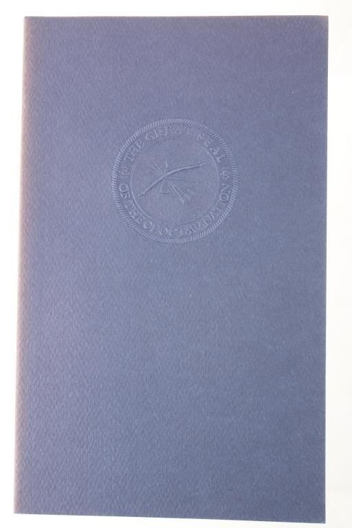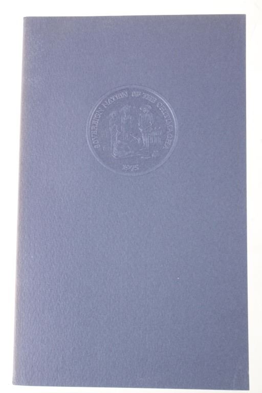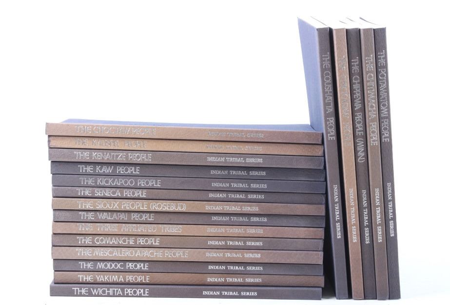 For your consideration is a collection of 19 limited edition, signed books in the Indian Tribal Series (1972-1977), Phoenix, AZ. There are 19 volumes in dark blue wraps with an embossed tribal seal medallion on the covers. This collection consists of Potawatomi, Chitimacha, Chippewa, Chickasaw, Coushatta, Choctaw, Kalispel, Kenaitze, Kaw, Kickapoo, Seneca, Sioux, Walapai, Three Affiliated Tribes, Comanche, Mescalero, Modoc, Yakima, and Wichita. Each book is signed and has a number showing what copy it is. On the front cover of each of these books is the respective tribal seal. These books each have around 107 pages. Each of the books measures 9" tall by 5 1/2" wide and 3/8" thick.