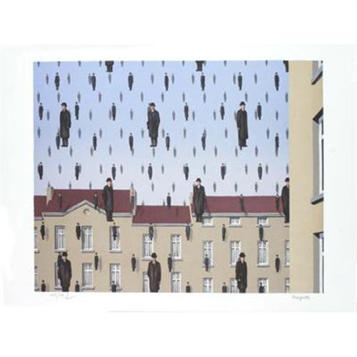 Notes:Lithograph after (d'apres) Magritte, facsimile signed with Magritte Estate watermark, authorized by ADAGP, France. Printed on pure chiffon, Velin de Rives, 300 gr/square meter. This image was recreated by a master engraver and required over eighteen passes through a flat-bed lithographic press to be completed. Each print is signed in the plate, stamped with the seal of the Magriite Estate and signed by the publisher on the verso. This is part of an editon of 300 and measures 22 3/4 x 30 3/4 inches. La Golconde is one of the better known images by Magritte. It was done in 1953 and is part of the Menil Collection in Houston Texas. "Raindrops resemble each other as do men". Men are considered here as objects, almost similar and indifferent. Apparently quite simple, made up of only three elements(sky, men and buildings), this painting yet allows the spectator all possible interpretations.
