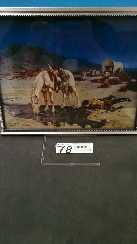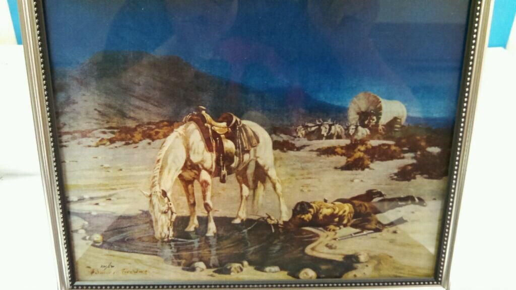 8 X 10 Framed print of "The End of the Day" by Belmore Brownie. Numbered limited edition in full color depicting a desert scene of a cowboy & his horse drinking from a small pool of water at dusk.
