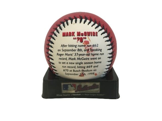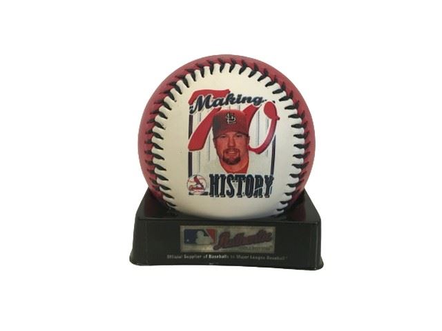 Ball features red and white panels with black stitching, a printed silver signature, a photograph of Mark McGwire with the words “Marking History 70” framing the picture, and “Mark McGwire ‘70’ ‘After hitting home run #62 on September 8th, and breaking RogerMaris’ 37-year-old home run record, Mark McGwire went on to set a new single season record, hitting #69 and #70 at Busch Stadium on September 27th, 1998.” Behind the text is a photo of McGwire at bat.