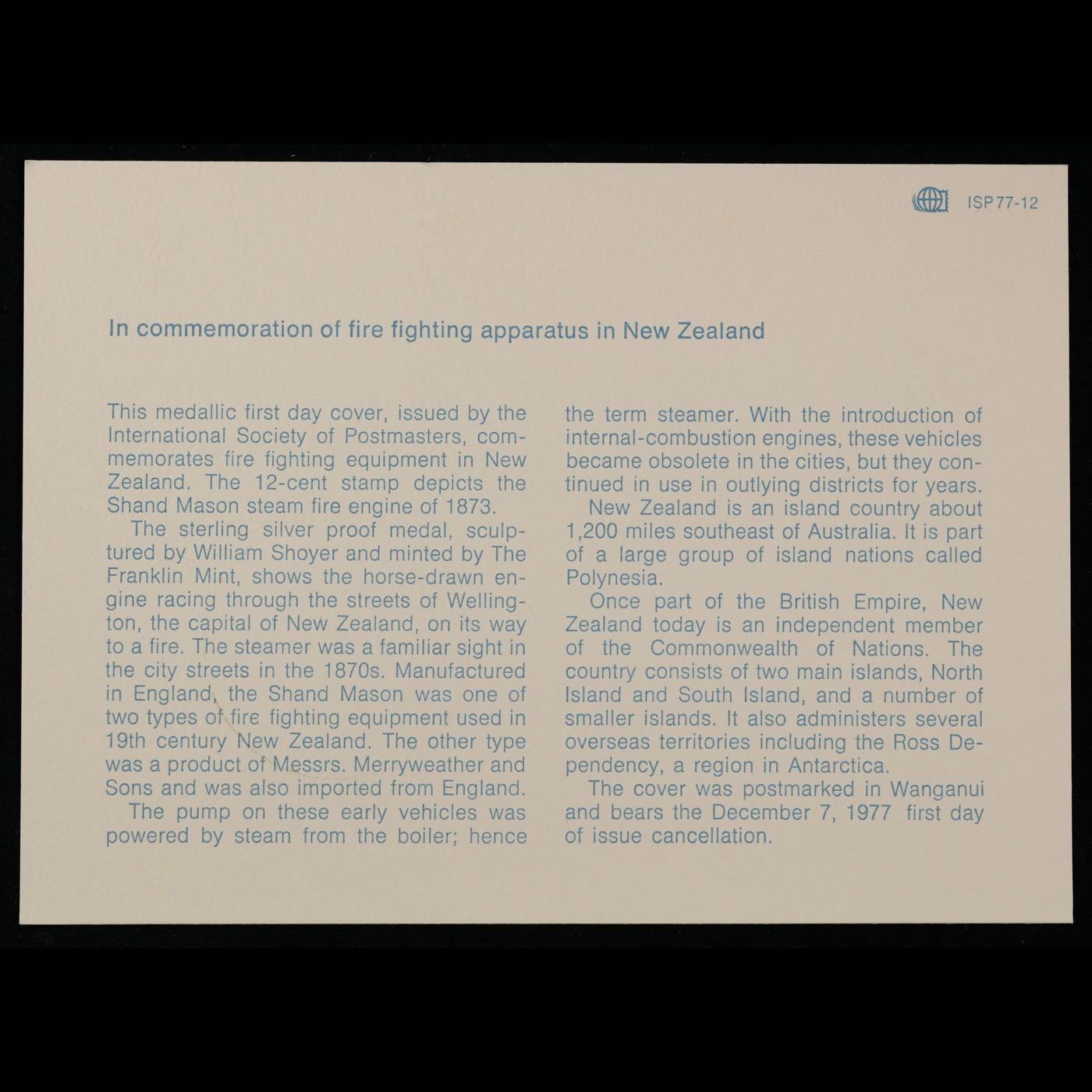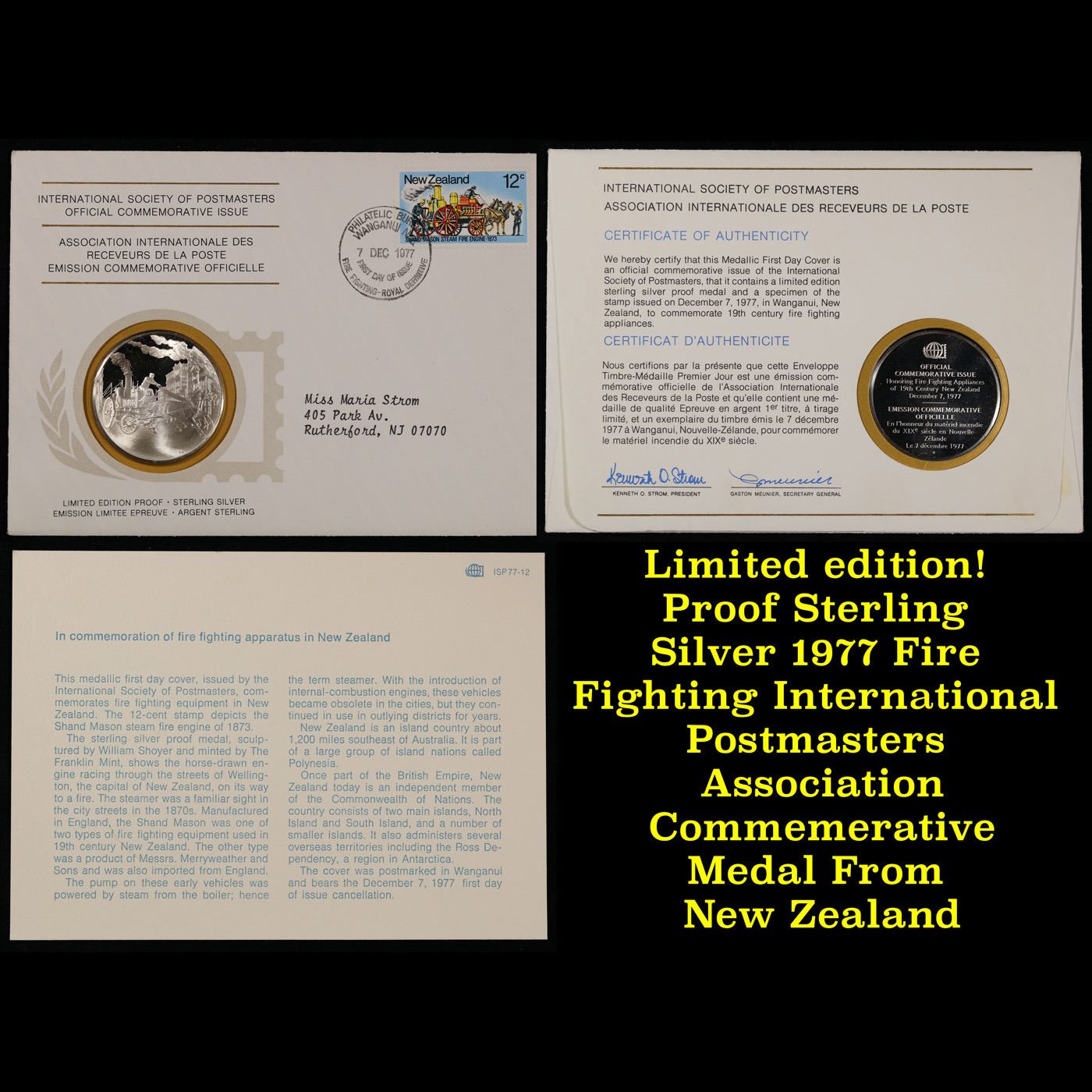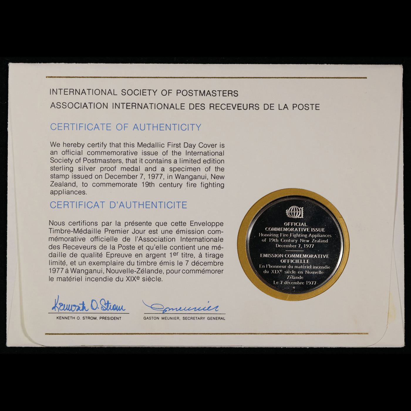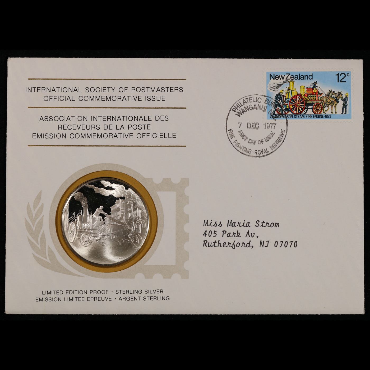 Limited edition! Proof Sterling Silver 1977 Fire Fighting International Postmasters Association Commemerative Medal From New Zealand.. A International Society of Postmasters Official Commemorative Issue 12/7/1977 Fire Fighting Coin, honoring the 19th century fire fighting appliances in New Zealand. Complete in orignial sealed package with COA and Stamp.