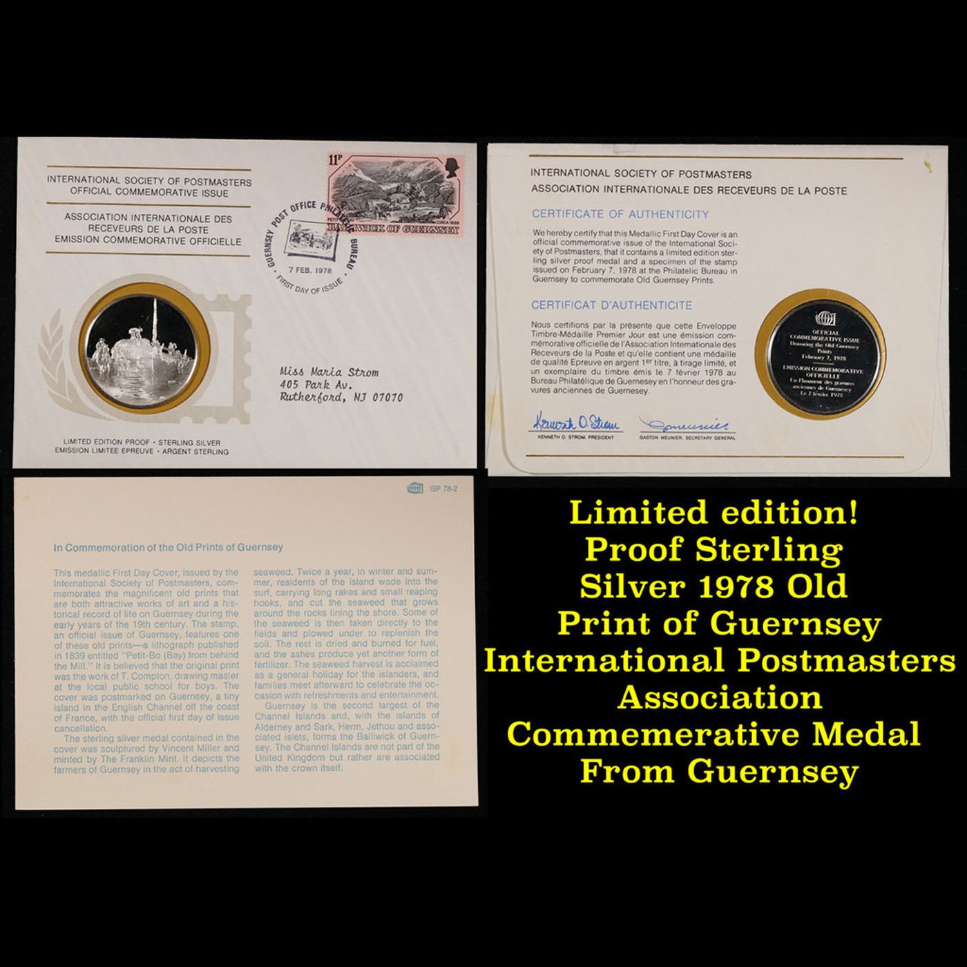 Limited edition! Proof Sterling Silver 1978 Old Print of Guernsey International Postmasters Association Commemerative Medal From Guernsey.. A International Society of Postmasters Official Commemorative Issue February/7/1978 Honoring the Old Guernsey Prints in Guernsey. Complete in orignial sealed package with COA and Stamp.