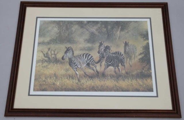 Limited edition Wildlife print hand signed lower right Eric Forlee. The print approximately 17-1/2”x25-1/2” nicely framed and matted showing subject of zebra. Entitled “Running Free” numbered #221 of 950 firstrun or proof. From the Robert E. Petersen Estate who was the publisher for this issue. Est.; $175-$350