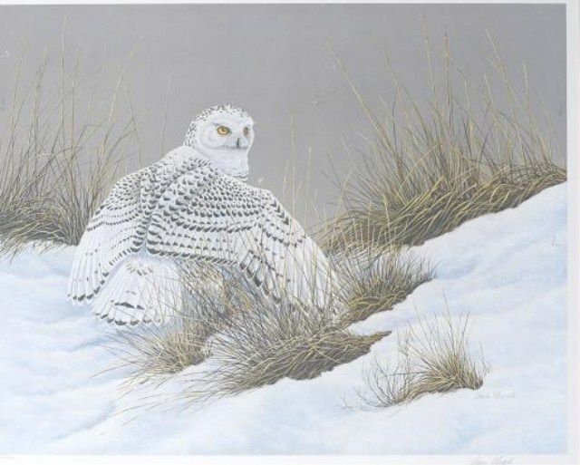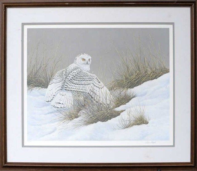 Limited edition lithograph of Snow Owl by David Chapple numbered 129 of 950 and signed. Approximately 19-1/2”x24” no glass, slight scratches and damage. Est. $25.00-$50.00