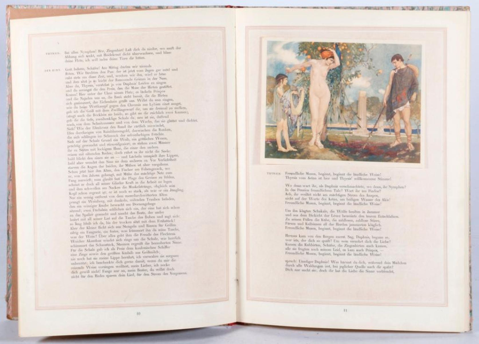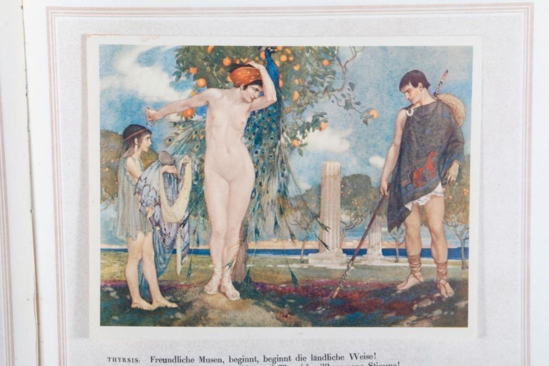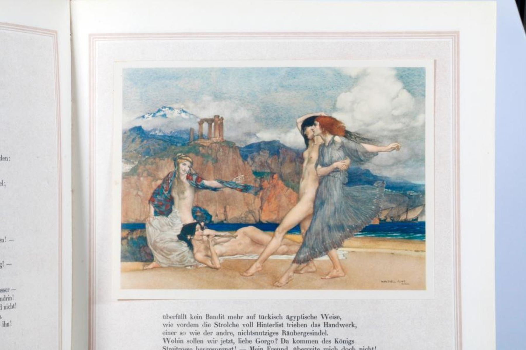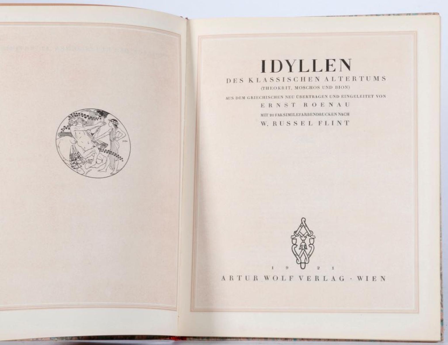 A 1921 limited folio edition (1393/1400) of Idyllen by Ernst Roenau, illustratied with twenty wonderful tipped in color plates by W. Russell. Size: 13 ½ inches high x 10. Condition: Good. Date: 1921.