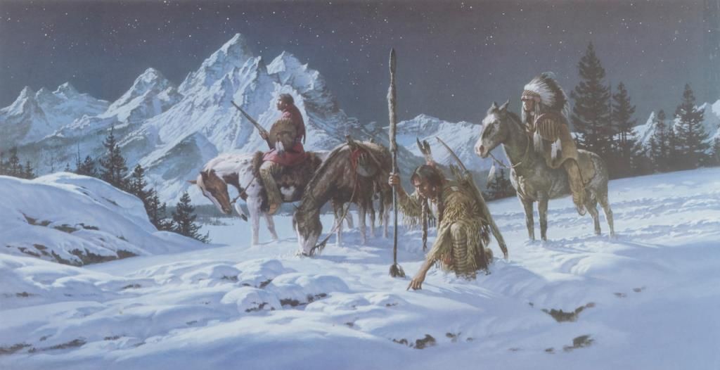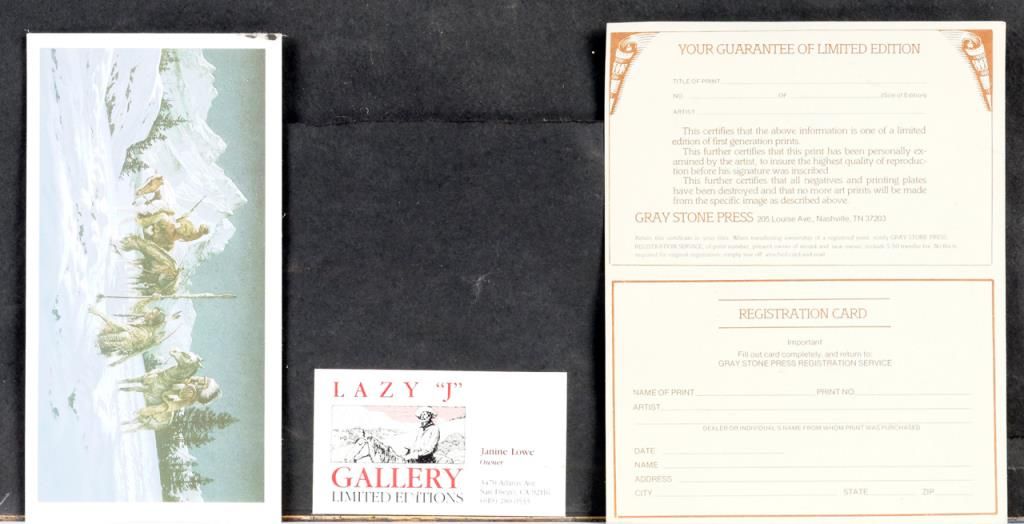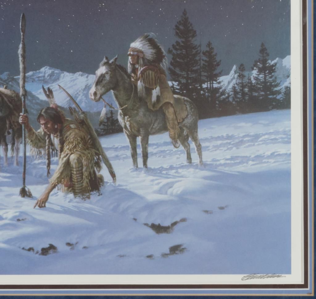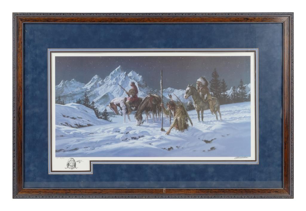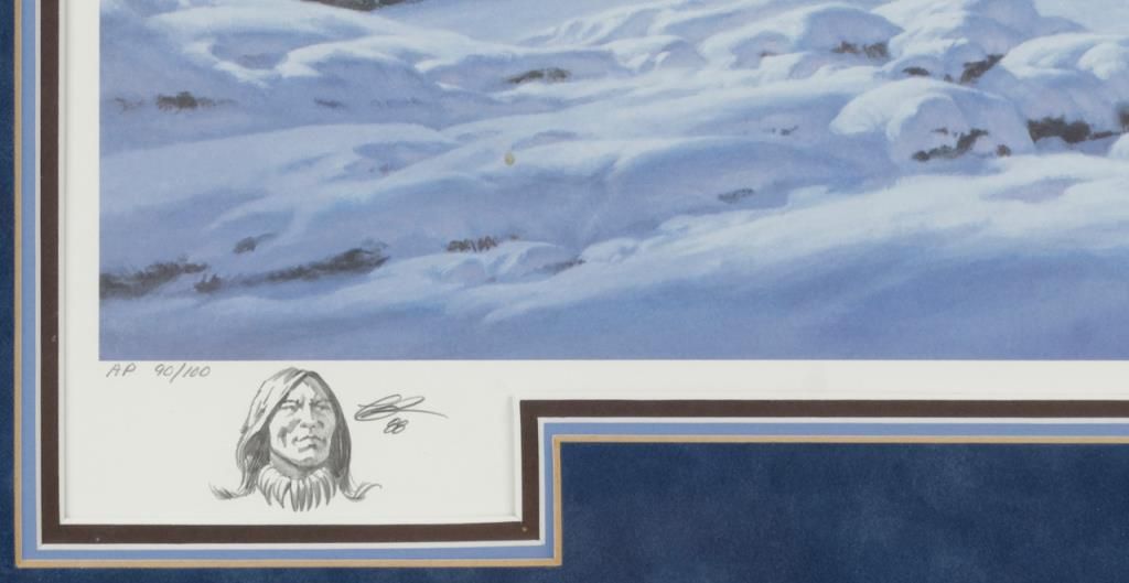 Limited edition painting showing Indians in snow. Beautifully framed and matted. Hand signed with small vignette or scene on edge. Dated 1988. Signature is illegible. Approx 12” x 20”. Also marked artist proof #90 of 100. Est.: $150 -$300.