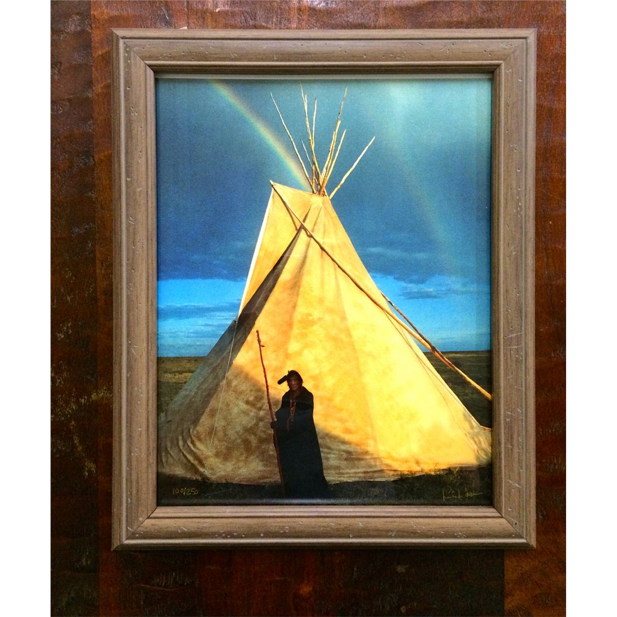 This print is number 10 of 250 and shows an Indian in front of Tee Pee with a beautiful backdrop. It is titled "The Sentinel" and we could not read the photographers signature. It measures approx. 13 ¼” wide by 16 ½” tall.