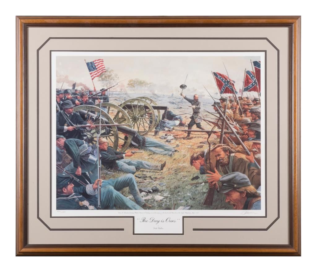 Limited edition print entitled “The Day is Ours” by Dale Gallon numbered 334 of 1500 portraying Gen. Armistead leading Pickett’s division during the break of the Union line at “The Angle” in Gettysburg 1863. Approximately 22”x 26” notincluding frame. Est.: $100-$300