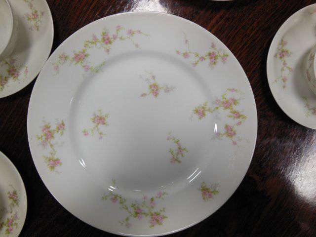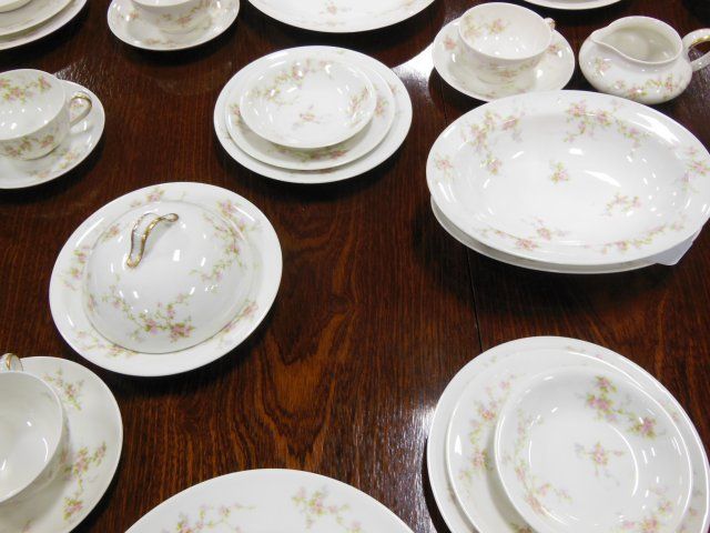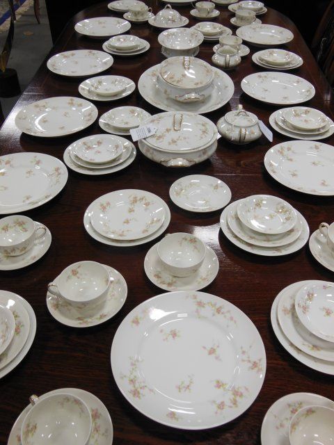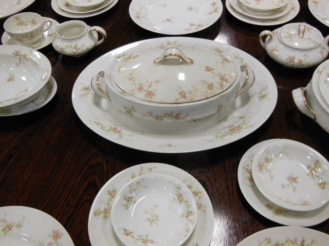 Design depicting pink roses and leaves. Consisting of: 2 Covered Tureens, 9 Dinner Plates, 1 Covered Butter Dish, Creamer and Sugar, 1 Open Vegetable Bowl, 1 Large Platter, 1 Small Platter, 11 Small Bowls, 12 Cake Dishes, 12 Saucers, 11 Cups, 12 Bread and Butter Dishes. Total 74 Pieces.